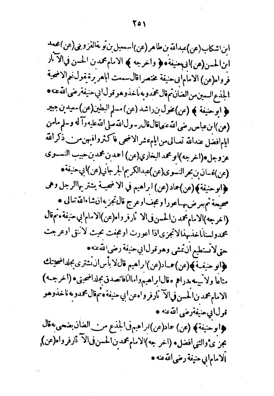 (أبو حنيفة) (عن) مخول بن راشد (عن) مسلم البطين (عن) سعيد بن جبير (عن) ابن عباس رضي الله عنهما قال قال رسول الله صلى الله عليه وآله وسلم ما من أيام أفضل عند الله تعالى من أيام عشر الأضحى فأكثروا فيهن من ذكر الله عز وجل* (أخرجه) أبو محمد البخاري (عن) أحمد بن محمد بن حبيب النسوي (عن) غسان بن بحر النسوي (عن) عبد الكريم الجرجاني (عن) أبي حنيفة*