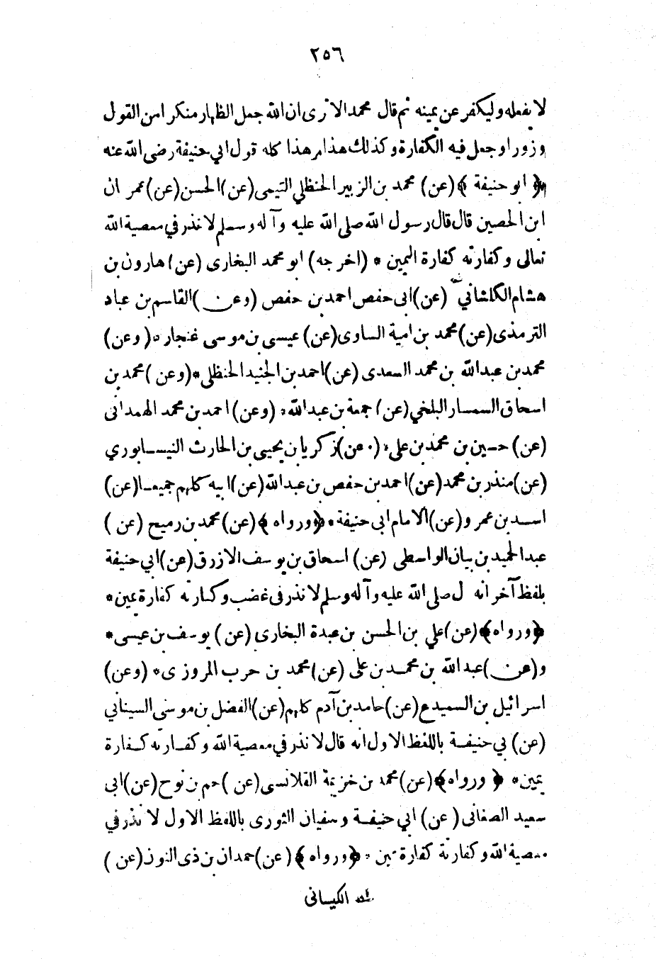 (أبو حنيفة) (عن) محمد بن الزبير الحنظلي التيمي (عن) الحسن (عن) عمر أن ابن الحصين قال قال رسول الله صلى الله عليه وآله وسلم لا نذر في معصية الله تعالى وكفارته كفارة اليمين* (أخرجه) أبو محمد البخاري (عن) هارون بن هشام الكلشاني (عن) أبي حفص أحمد بن حفص (وعن) القاسم بن عباد الترمذي (عن) محمد بن أمية الساوي (عن) عيسى بن موسى غنجار* (وعن) محمد بن عبد الله بن محمد السعدي (عن) أحمد بن الجنيد الحنظلي* (وعن) محمد بن إسحاق السمسار البلخي (عن) جمعة بن عبد الله* (وعن) أحمد بن محمد الهمداني (عن) حسين بن محمد بن علي* (وعن) زكريا بن يحيى بن الحارث النيسابوري (عن) منذر بن محمد (عن) أحمد بن حفص بن عبد الله (عن) أبيه كلهم جميعاً (عن) أسد بن عمرو (عن) الإمام أبي حنيفة* (ورواه) (عن) محمد بن رميح (عن) عبد الحميد بن بيان الواسطي (عن) إسحاق بن يوسف الأزرق (عن) أبي حنيفة بلفظ آخر أنه قال صلى الله عليه وآله وسلم لا نذر في غضب وكفارته كفارة يمين* (ورواه) (عن) علي بن الحسن بن عبدة البخاري (عن) يوسف بن عيسى* و (عن) عبد الله بن محمد بن علي (عن) محمد بن حرب المروزي* (وعن) إسرائيل بن السميدع (عن) حامد بن آدم كلهم (عن) الفضل بن موسى السيناني (عن) أبي حنيفة باللفظ الأول أنه قال لا نذر في معصية الله وكفارته كفارة يمين* (ورواه) (عن) محمد بن خزيمة القلانسي (عن) حم بن نوح (عن) أبي سعيد الصغاني (عن) أبي حنيفة وسفيان الثوري باللفظ الأول لا نذر في معصية الله وكفارته كفارة يمين* (ورواه) (عن) حمدان بن ذي النون (عن)