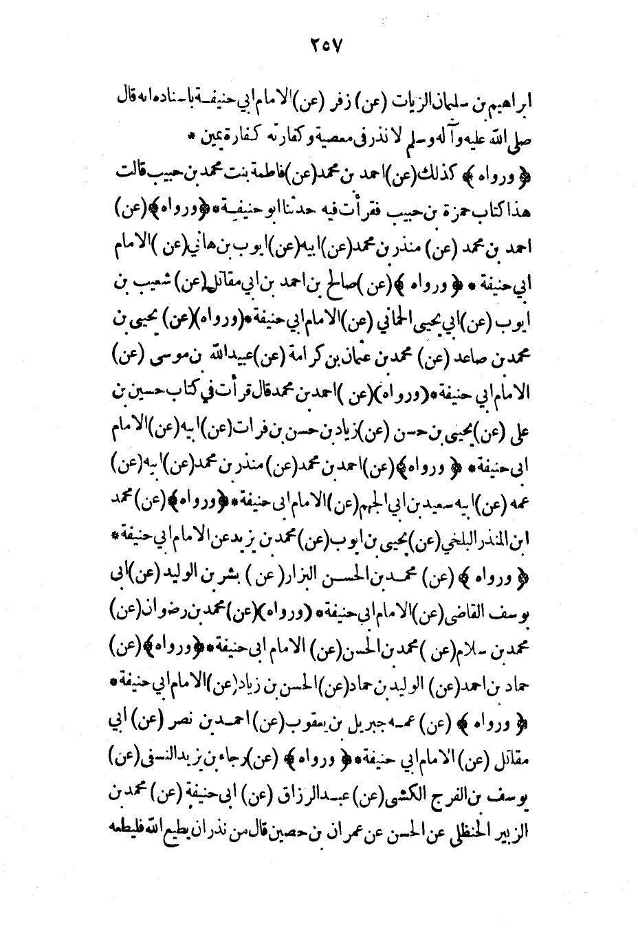 (ورواه) كذلك (عن) أحمد بن محمد (عن) فاطمة بنت محمد بن حبيب قالت هذا كتاب حمزة بن حبيب فقرأت فيه حدثنا أبو حنيفة* (ورواه) (عن) أحمد بن محمد (عن) منذر بن محمد (عن) أبيه (عن) أيوب بن هاني (عن) الإمام أبي حنيفة* (ورواه) (عن) صالح بن أحمد بن أبي مقاتل (عن) شعيب بن أيوب (عن) أبي يحيى الحماني (عن) الإمام أبي حنيفة* (ورواه) (عن) يحيى بن محمد بن صاعد (عن) محمد بن عثمان بن كرامة (عن) عبيد الله بن موسى (عن) الإمام أبي حنيفة* (ورواه) (عن) أحمد بن محمد قال قرأت في كتاب حسين بن علي (عن) يحيى بن حسن (عن) زياد بن حسن بن فرات (عن) أبيه (عن) الإمام أبي حنيفة* (ورواه) (عن) أحمد بن محمد (عن) منذر بن محمد (عن) أبيه (عن) عمه (عن) أبيه سعيد بن أبي الجهم (عن) الإمام أبي حنيفة* (ورواه) (عن) محمد ابن المنذر البلخي (عن) يحيى بن أيوب (عن) محمد بن يزيد عن الإمام أبي حنيفة* (ورواه) (عن) محمد بن الحسن البزار (عن) بشر بن الوليد (عن) أبي يوسف القاضي (عن) الإمام أبي حنيفة* (ورواه) (عن) محمد بن رضوان (عن) محمد بن سلام (عن) محمد بن الحسن (عن) الإمام أبي حنيفة* (ورواه) (عن) حماد بن أحمد (عن) الوليد بن حماد (عن) الحسن بن زياد (عن) الإمام أبي حنيفة* (ورواه) (عن) عمه جبريل بن يعقوب (عن) أحمد بن نصر (عن) أبي مقاتل (عن) الإمام أبي حنيفة* (ورواه) (عن) رجاء بن يزيد النسفي (عن) يوسف بن الفرج الكشي (عن) عبد الرزاق (عن) أبي حنيفة (عن) محمد بن الزبير الحنظلي عن الحسن عن عمران بن حصين قال من نذر أن يطيع الله فليطعه