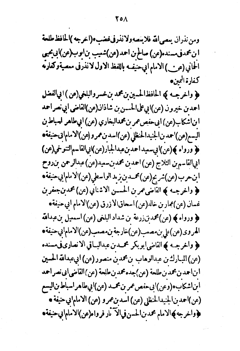 (وأخرجه) الحافظ الحسين بن محمد بن خسرو البلخي (عن) أبي الفضل أحمد بن خيرون (عن) أبي علي الحسن بن شاذان (عن) القاضي أبي نصر أحمد ابن اشكاب (عن) أبي حفص عمر بن محمد البخاري (عن) أبي طاهر أسباط بن اليسع (عن) أحمد بن الجنيد الحنظلي (عن) أسد بن عمرو (عن) الإمام أبي حنيفة* (ورواه) (عن) أبي سعيد أحمد بن عبد الجبار (عن) أبي القاسم التنوخي (عن) أبي القاسم بن الثلاج (عن) أحمد بن محمد بن سعيد (عن) عبد الرحمن بن روح ابن حرب (عن) شريح (عن) محمد بن يزيد الواسطي (عن) الإمام أبي حنيفة* (وأخرجه) القاضي عمر بن الحسن الأشناني (عن) محمد بن جعفر بن غسان (عن) عمار بن خالد (عن) إسحاق الأزرق (عن) الإمام أبي حنيفة*