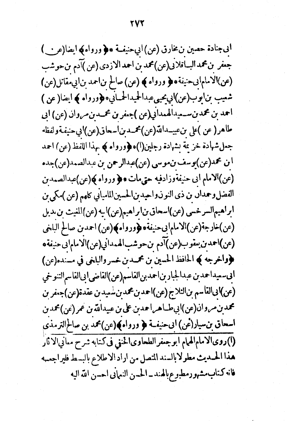 أبي جنادة حصين بن مخارق (عن) أبي حنيفة* (ورواه) أيضاً (عن) جعفر بن محمد الباقلاني (عن) محمد بن أحمد الأزدي (عن) آدم بن حوشب (عن) الإمام أبي حنيفة* (ورواه) (عن) صالح بن أحمد بن أبي مقاتل (عن) شعيب بن أيوب (عن) أبي يحيى عبد الحميد الحماني* (ورواه) أيضاً (عن) أحمد بن محمد بن سعيد الهمداني (عن) جعفر بن محمد بن مروان (عن) أبي طاهر (عن) علي بن عبيد الله (عن) محمد بن إسحاق (عن) أبي حنيفة ولفظه جعل شهادة خزيمة بشهادة رجلين* (ورواه) بهذا اللفظ (عن) أحمد ابن محمد (عن) يوسف بن موسى (عن) عبد الرحمن بن عبد الصمد (عن) جده (عن) الإمام أبي حنيفة وزاد فيه حتى مات* (ورواه) (عن) عبد الصمد بن الفضل وحمدان بن ذي النون وأحيد بن الحسين المامياني كلهم (عن) مكي بن إبراهيم السرخسي (عن) إسحاق بن إبراهيم (عن) أبيه (عن) المغيث بن بديل (عن) خارجة (عن) الإمام أبي حنيفة* (ورواه) (عن) أحمد بن صالح البلخي (عن) أحمد بن يعقوب (عن) آدم بن حوشب الهمداني (عن) الإمام أبي حنيفة* (وأخرجه) الحافظ الحسين بن محمد بن خسرو البلخي في مسنده (عن) أبي سعيد أحمد بن عبد الجبار بن أحمد بن القاسم (عن) القاضي أبي القاسم التنوخي (عن) أبي القاسم بن الثلاج (عن) أحمد بن محمد بن سعيد بن عقدة (عن) جعفر بن محمد بن مروان (عن) أبي طاهر أحمد بن علي بن عبيد الله بن عمر (عن) محمد بن إسحاق بن سيار (عن) أبي حنيفة (ورواه) (عن) محمد بن صالح الترمذي