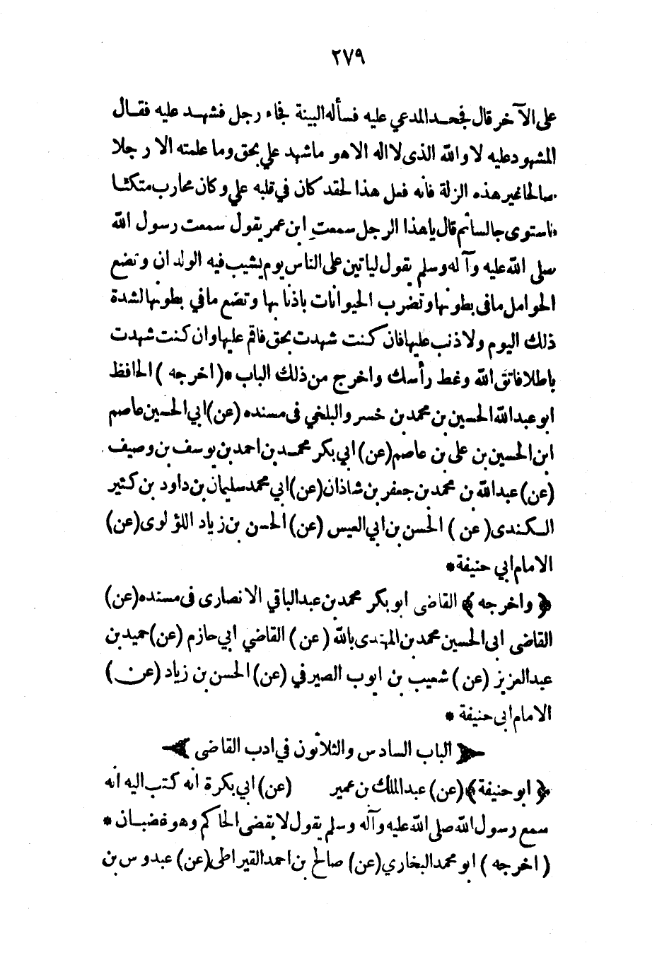 (أبو حنيفة) (عن) عبد الملك بن عمير (عن) أبي بكرة أنه كتب إليه أنه سمع رسول الله صلى الله عليه وآله وسلم يقول لا يقضي الحاكم وهو غضبان* (أخرجه) أبو محمد البخاري (عن) صالح بن أحمد القيراطي (عن) عبدوس بن