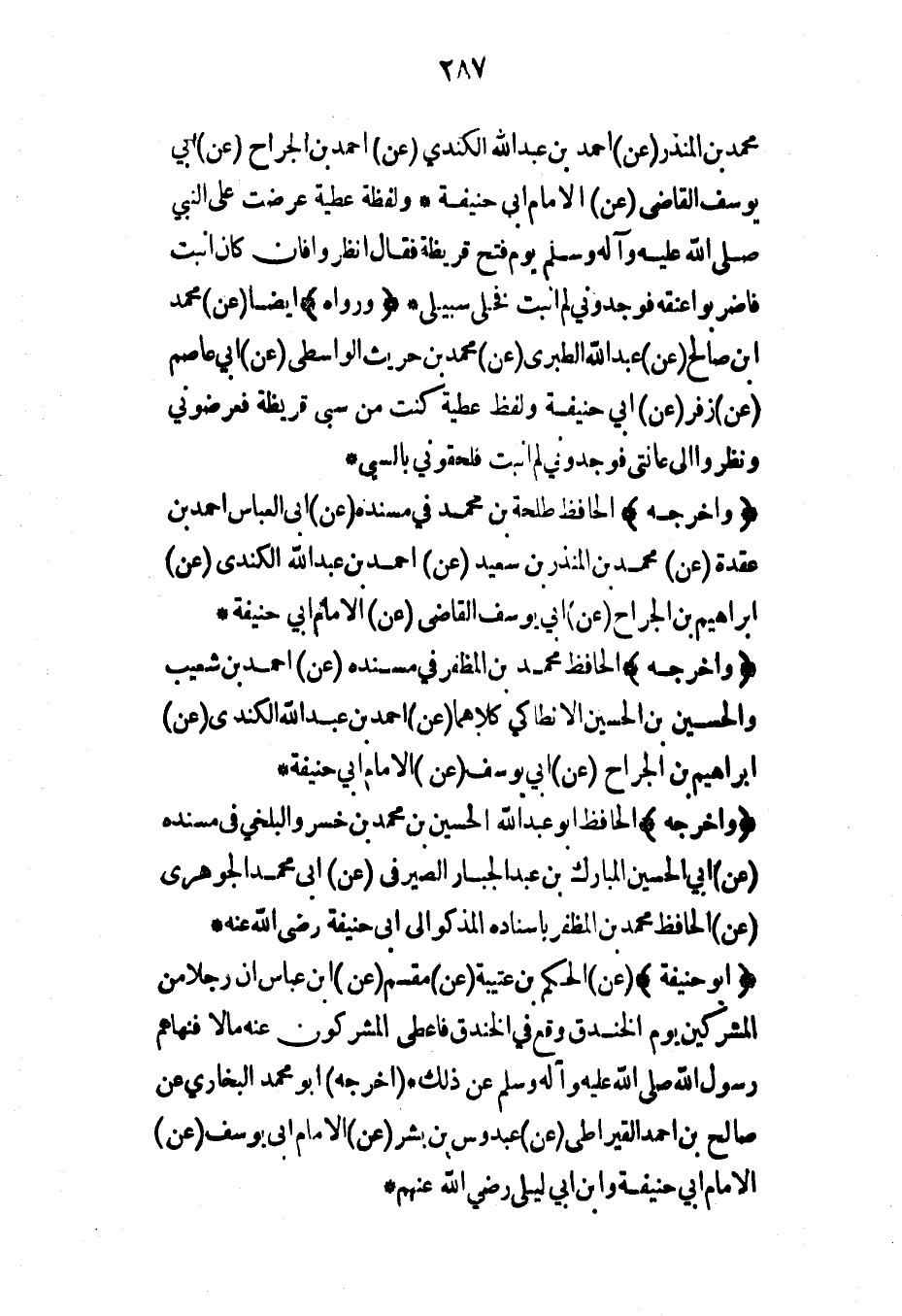 (أبو حنيفة) (عن) الحكم بن عتيبة (عن) مقسم (عن) ابن عباس أن رجلاً من المشركين يوم الخندق وقع في الخندق فأعطى المشركون عنه مالاً فنهاهم رسول الله صلى الله عليه وآله وسلم عن ذلك* (أخرجه) أبو محمد البخاري عن صالح بن أحمد القيراطي (عن) عبدوس بن بشر (عن) الإمام أبي يوسف (عن) الإمام أبي حنيفة وابن أبي ليلى رضي الله عنهم*