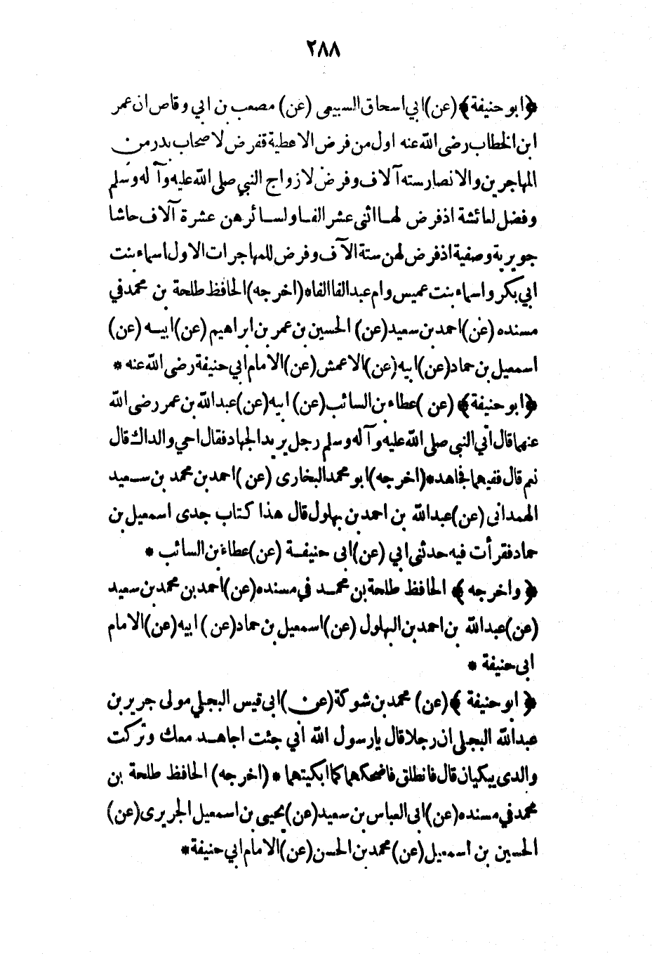 (أبو حنيفة) (عن) أبي إسحاق السبيعي (عن) مصعب بن أبي وقاص أن عمر ابن الخطاب رضي الله عنه أول من فرض الأعطية ففرض لأصحاب بدر من المهاجرين والأنصار ستة آلاف وفرض لأزواج النبي صلى الله عليه وآله وسلم وفضل لعائشة إذ فرض لها اثنى عشر ألفاً ولسائرهن عشرة آلاف حاشا جويرية وصفية إذ فرض لهن ستة آلاف وفرض للمهاجرات الأول أسماء بنت أبي بكر وأسماء بنت عميس وأم عبد ألفاً ألفاً* (أخرجه) الحافظ طلحة بن محمد في مسنده (عن) أحمد بن سعيد (عن) الحسين بن عمر بن إبراهيم (عن) أبيه (عن) إسماعيل بن حماد (عن) أبيه (عن) الأعمش (عن) الإمام أبي حنيفة رضي الله عنه*