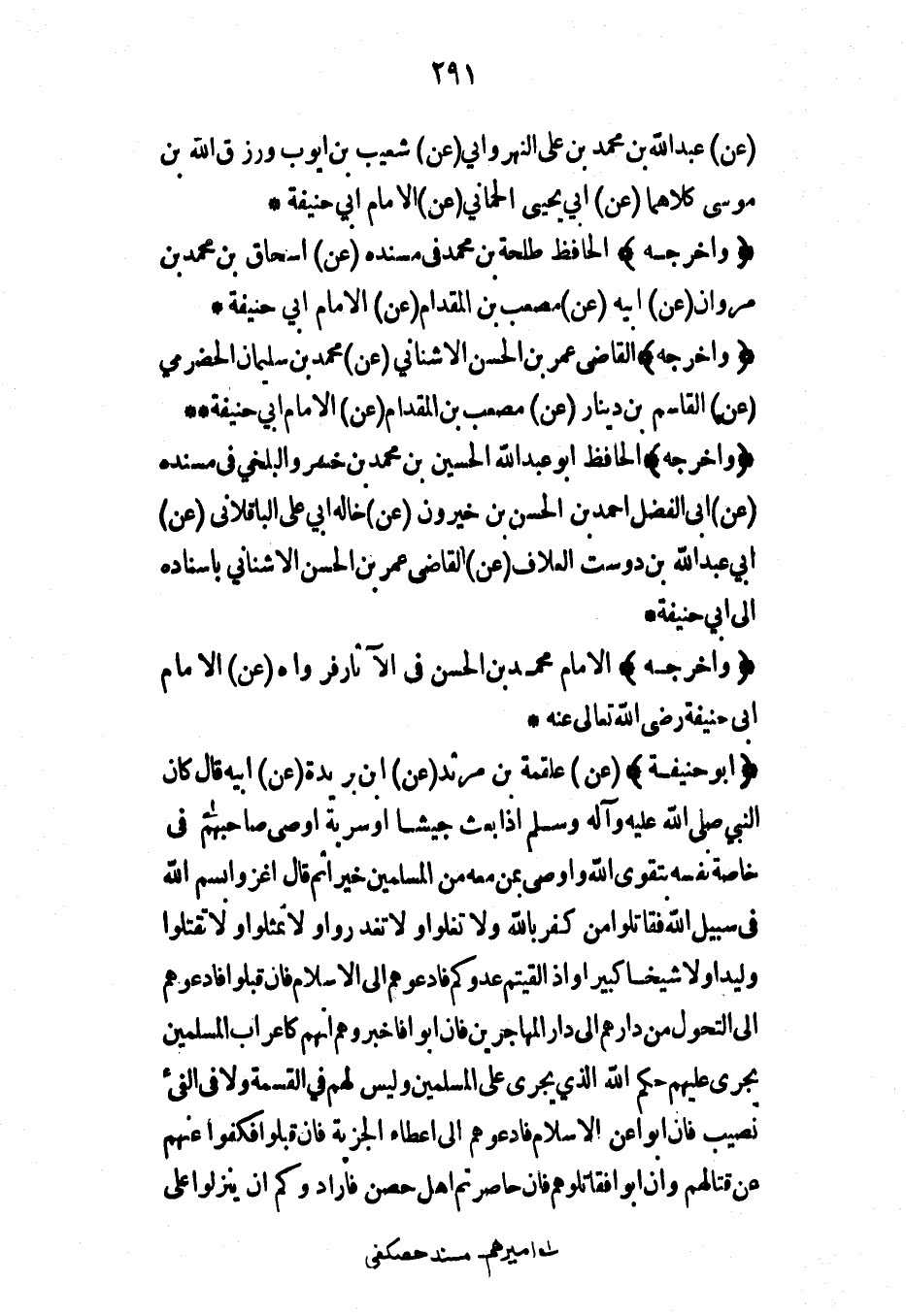 (عن) عبد الله بن محمد بن علي النهرواني (عن) شعيب بن أيوب ورزق الله بن موسى كلاهما (عن) أبي يحيى الحماني (عن) الإمام أبي حنيفة*