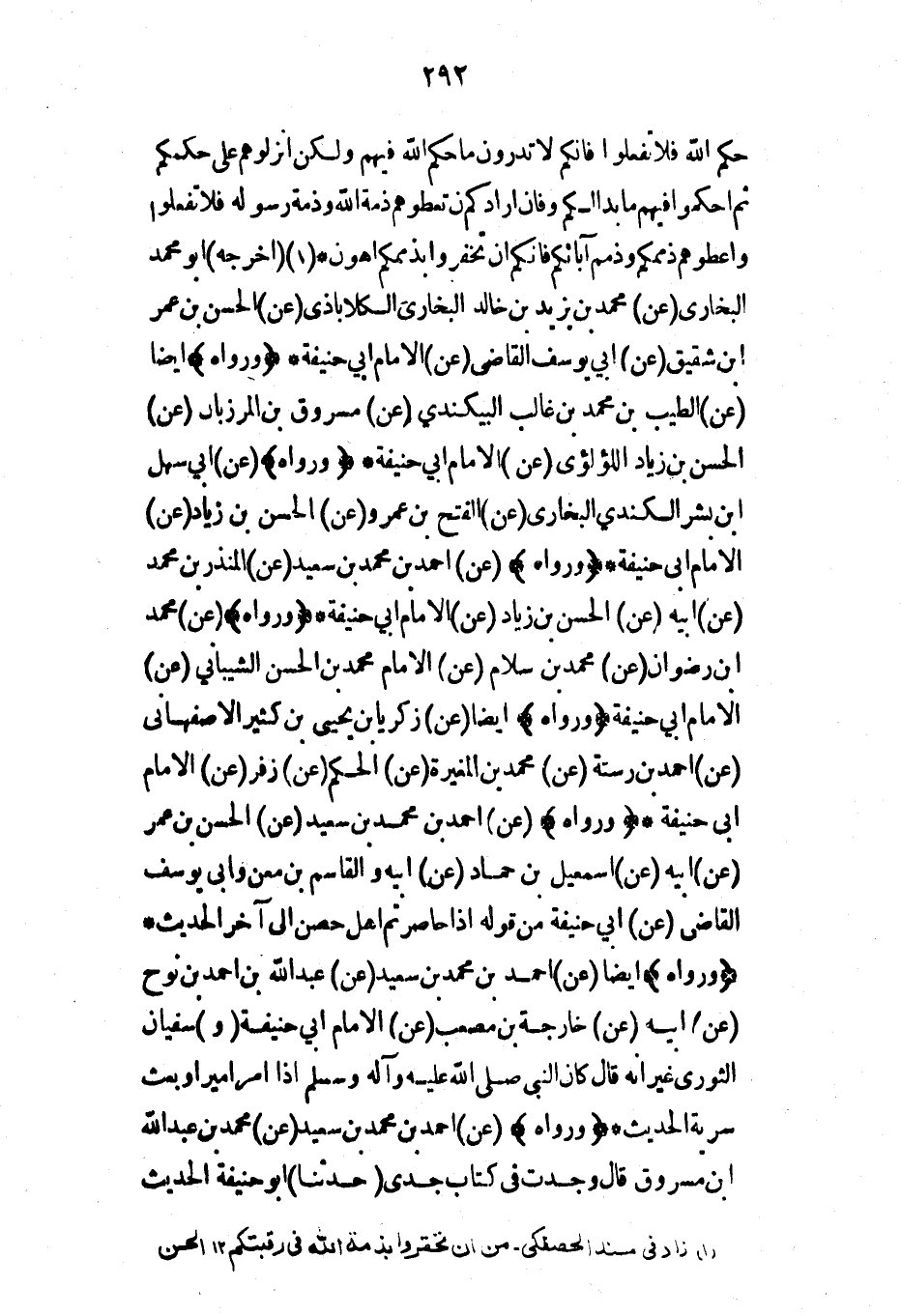 حكم الله فلا تفعلوا فإنكم لا تدرون ما حكم الله فيهم ولكن أنزلوهم على حكمكم ثم احكموا فيهم ما بدا لكم وإن أرادوكم أن تعطوهم ذمة الله وذمة رسوله فلا تفعلوا وأعطوهم ذممكم وذمم آبائكم فإنكم إن تخفروا بذممكم أهون* (أخرجه) أبو محمد البخاري (عن) محمد بن يزيد بن خالد البخاري الكلاباذي (عن) الحسن بن عمر ابن شقيق (عن) أبي يوسف القاضي (عن) الإمام أبي حنيفة* (ورواه) أيضاً (عن) الطيب بن محمد بن غالب البيكندي (عن) مسروق بن المرزبان (عن) الحسن بن زياد اللؤلؤي (عن) الإمام أبي حنيفة* (ورواه) (عن) أبي سهل ابن بشر الكندي البخاري (عن) الفتح بن عمرو (عن) الحسن بن زياد (عن) الإمام أبي حنيفة* (ورواه) (عن) أحمد بن محمد بن سعيد (عن) المنذر بن محمد (عن) أبيه (عن) الحسن بن زياد (عن) الإمام أبي حنيفة* (ورواه) (عن) محمد ابن رضوان (عن) محمد بن سلام (عن) الإمام محمد بن الحسن الشيباني (عن) الإمام أبي حنيفة (ورواه) أيضاً (عن) زكريا بن يحيى بن كثير الأصفهاني (عن) أحمد بن رستة (عن) محمد بن المغيرة (عن) الحكم (عن) زفر (عن) الإمام أبي حنيفة* (ورواه) (عن) أحمد بن محمد بن سعيد (عن) الحسن بن عمر (عن) أبيه (عن) إسماعيل بن حماد (عن) أبيه والقاسم بن معن وأبي يوسف القاضي (عن) أبي حنيفة من قوله إذا حاصرتم أهل حصن إلى آخر الحديث* (ورواه) أيضاً (عن) أحمد بن محمد بن سعيد (عن) عبد الله بن أحمد بن نوح (عن) أبيه (عن) خارجة بن مصعب (عن) الإمام أبي حنيفة (و) سفيان الثوري غير أنه قال كان النبي صلى الله عليه وآله وسلم إذا أمر أميرا وبعث سرية الحديث* (ورواه) (عن) أحمد بن محمد بن سعيد (عن) محمد بن عبد الله بن مسروق قال وجدت في كتاب جدي (حدثنا) أبو حنيفة الحديث