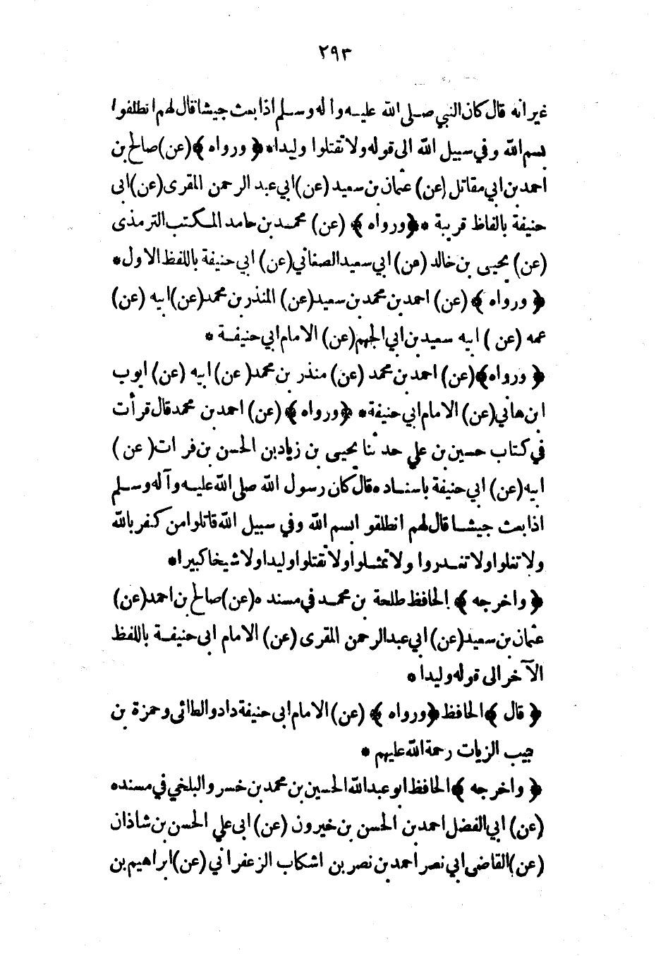 غير أنه قال كان النبي صلى الله عليه وآله وسلم إذا بعث جيشاً قال لهم انطلقوا بسم الله وفي سبيل الله إلى قوله ولا تقتلوا وليداً* (ورواه) (عن) صالح بن أحمد بن أبي مقاتل (عن) عثمان بن سعيد (عن) أبي عبد الرحمن المقري (عن) أبي حنيفة بألفاظ قريبة* (ورواه) (عن) محمد بن حامد المكتب الترمذي (عن) يحيى بن خالد (عن) أبي سعيد الصغاني (عن) أبي حنيفة باللفظ الأول* (ورواه) (عن) أحمد بن محمد بن سعيد (عن) المنذر بن محمد (عن) أبيه (عن) عمه (عن) أبيه سعيد بن أبي الجهم (عن) الإمام أبي حنيفة*