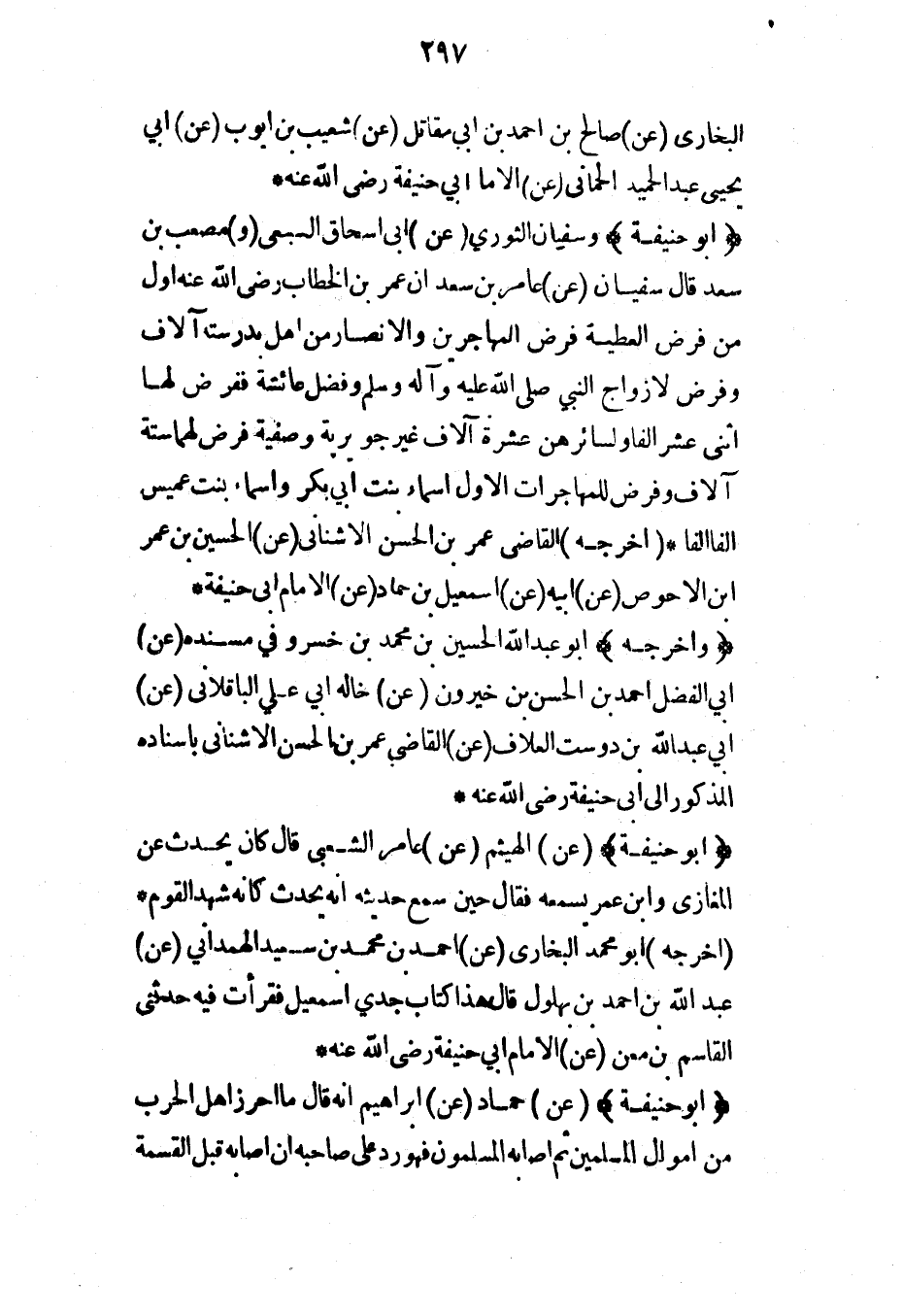 (أبو حنيفة) وسفيان الثوري (عن) أبي إسحاق السبيعي (و) مصعب بن سعد قال سفيان (عن) عامر بن سعد أن عمر بن الخطاب رضي الله عنه أول من فرض العطية فرض المهاجرين والأنصار من أهل بدر ستة آلاف وفرض لأزواج النبي صلى الله عليه وآله وسلم وفضل عائشة ففرض لها اثنى عشر ألفاً ولسائرهن عشرة آلاف غير جويرية وصفية فرض لهما ستة آلاف وفرض للمهاجرات الأول أسماء بنت أبي بكر وأسماء بنت عميس ألفاً ألفاً* (أخرجه) القاضي عمر بن الحسن الأشناني (عن) الحسين بن عمر ابن الأحوص (عن) أبيه (عن) إسماعيل بن حماد (عن) الإمام أبي حنيفة*