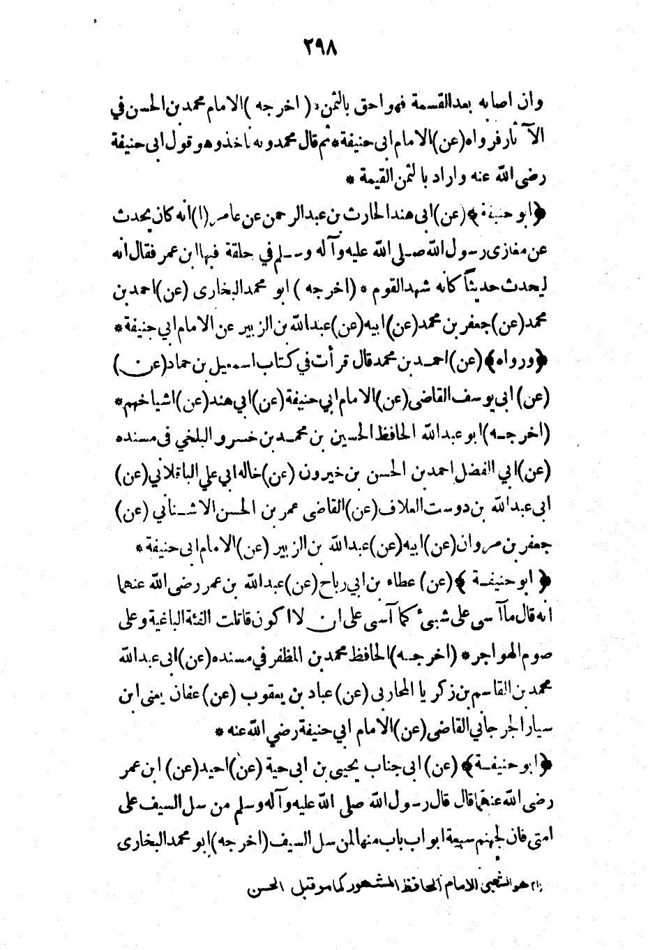 (أبو حنيفة) (عن) أبي هند الحارث بن عبد الرحمن عن عامر أنه كان يحدث عن مغازي رسول الله صلى الله عليه وآله وسلم في حلقة فيها ابن عمر فقال إنه ليحدث حديثاً كأنه شهد القوم* (أخرجه) أبو محمد البخاري (عن) أحمد بن محمد (عن) جعفر بن محمد (عن) أبيه (عن) عبد الله بن الزبير عن الإمام أبي حنيفة* (ورواه) (عن) أحمد بن محمد قال قرأت في كتاب إسماعيل بن حماد (عن) (عن) أبي يوسف القاضي (عن) الإمام أبي حنيفة (عن) أبي هند (عن) أشياخهم* (أخرجه) أبو عبد الله الحافظ الحسين بن محمد بن خسرو البلخي في مسنده (عن) أبي الفضل أحمد بن الحسن بن خيرون (عن) خاله أبي علي الباقلاني (عن) أبي عبد الله بن دوست العلاف (عن) القاضي عمر بن الحسن الأشناني (عن) جعفر بن مروان (عن) أبيه (عن) عبد الله بن الزبير (عن) الإمام أبي حنيفة*