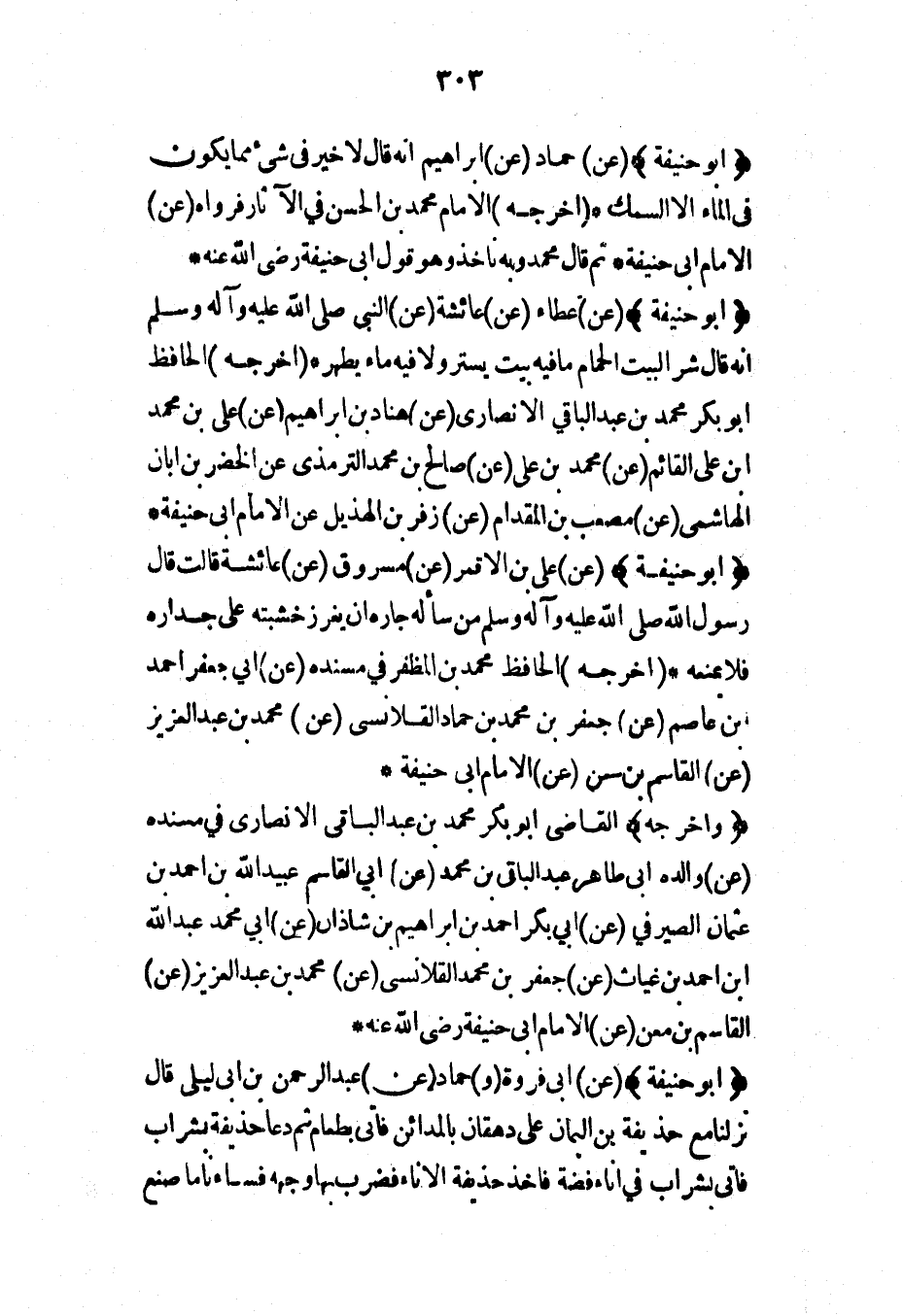 (أبو حنيفة) (عن) عطاء (عن) عائشة (عن) النبي صلى الله عليه وآله وسلم أنه قال شر البيت الحمام ما فيه بيت يستر ولا فيه ماء يطهر* (أخرجه) الحافظ أبو بكر محمد بن عبد الباقي الأنصاري (عن) هناد بن إبراهيم (عن) علي بن محمد ابن علي القائم (عن) محمد بن علي (عن) صالح بن محمد الترمذي عن الخضر بن أبان الهاشمي (عن) مصعب بن المقدام (عن) زفر بن الهذيل عن الإمام أبي حنيفة*