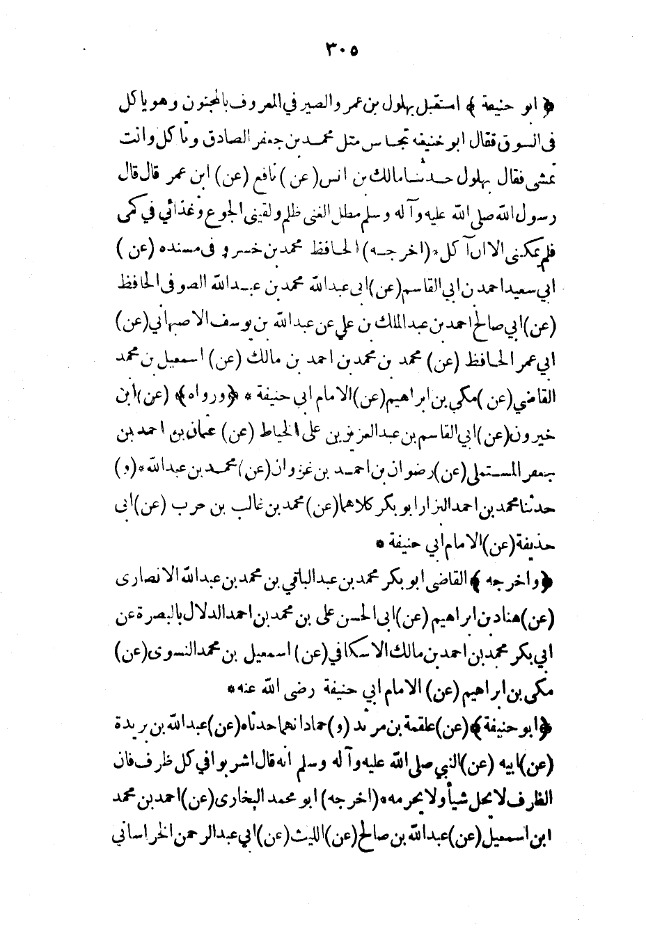 (وأخرجه) القاضي أبو بكر محمد بن عبد الباقي بن محمد بن عبد الله الأنصاري (عن) هناد بن إبراهيم (عن) أبي الحسن علي بن محمد بن أحمد الدلال بالبصرة عن أبي بكر محمد بن أحمد بن مالك الاسكافي (عن) إسماعيل بن محمد النسوي (عن) مكي بن إبراهيم (عن) الإمام أبي حنيفة رضي الله عنه*