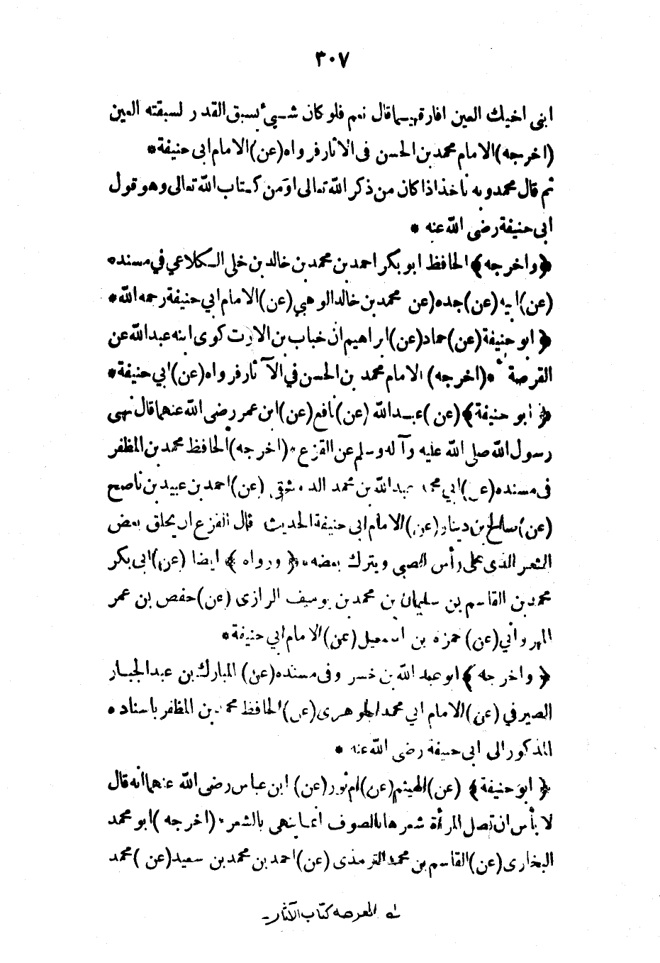 (أبو حنيفة) (عن) حماد (عن) إبراهيم أن خباب بن الأرت كوى ابنه عبد الله عن القرصة* (أخرجه) الإمام محمد بن الحسن في الآثار فرواه (عن) أبي حنيفة*