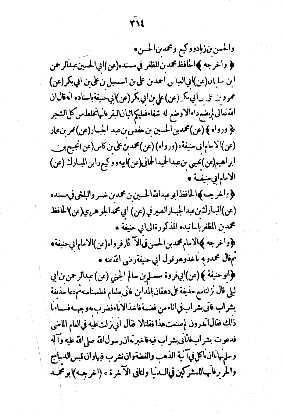 (أبو حنيفة) (عن) أبي فروة مسلم بن سالم الجهني (عن) عبد الرحمن بن أبي ليلى قال نزلنا مع حذيفة على دهقان بالمداين فأتى بطعام فطعمنا منه ثم دعا حذيفة بشراب فأتى بشراب في إناء من فضة فأخذ الإناء فضرب به وجهه فساءنا ذلك فقال أتدرون لما صنعت هذا فقلنا لا فقال إني نزلت عليه في العام الماضي فدعوت بشراب فأتاني بشراب فيه فأخبرته أن رسول الله صلى الله عليه وآله وسلم نهانا أن نأكل في آنية الذهب والفضة وأن نشرب فيها وأن نلبس الديباج والحرير فإنها للمشركين في الدنيا ولنا في الآخرة* (أخرجه) أبو محمد