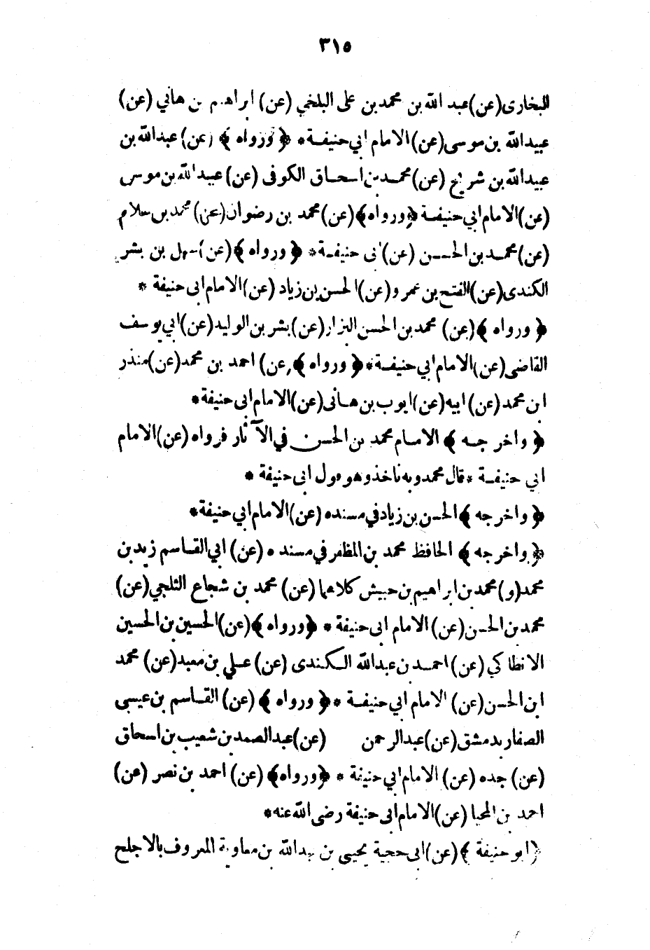 البخاري (عن) عبد الله بن محمد بن علي البلخي (عن) إبراهيم بن هاني (عن) عبيد الله بن موسى (عن) الإمام أبي حنيفة* (ورواه) (عن) عبد الله بن عبيد الله بن شريح (عن) محمد بن إسحاق الكوفي (عن) عبيد الله بن موسى (عن) الإمام أبي حنيفة (ورواه) (عن) محمد بن رضوان (عن) محمد بن سلام (عن) محمد بن الحسن (عن) أبي حنيفة* (ورواه) (عن) سهل بن بشر الكندي (عن) الفتح بن عمرو (عن) الحسن بن زياد (عن) الإمام أبي حنيفة*