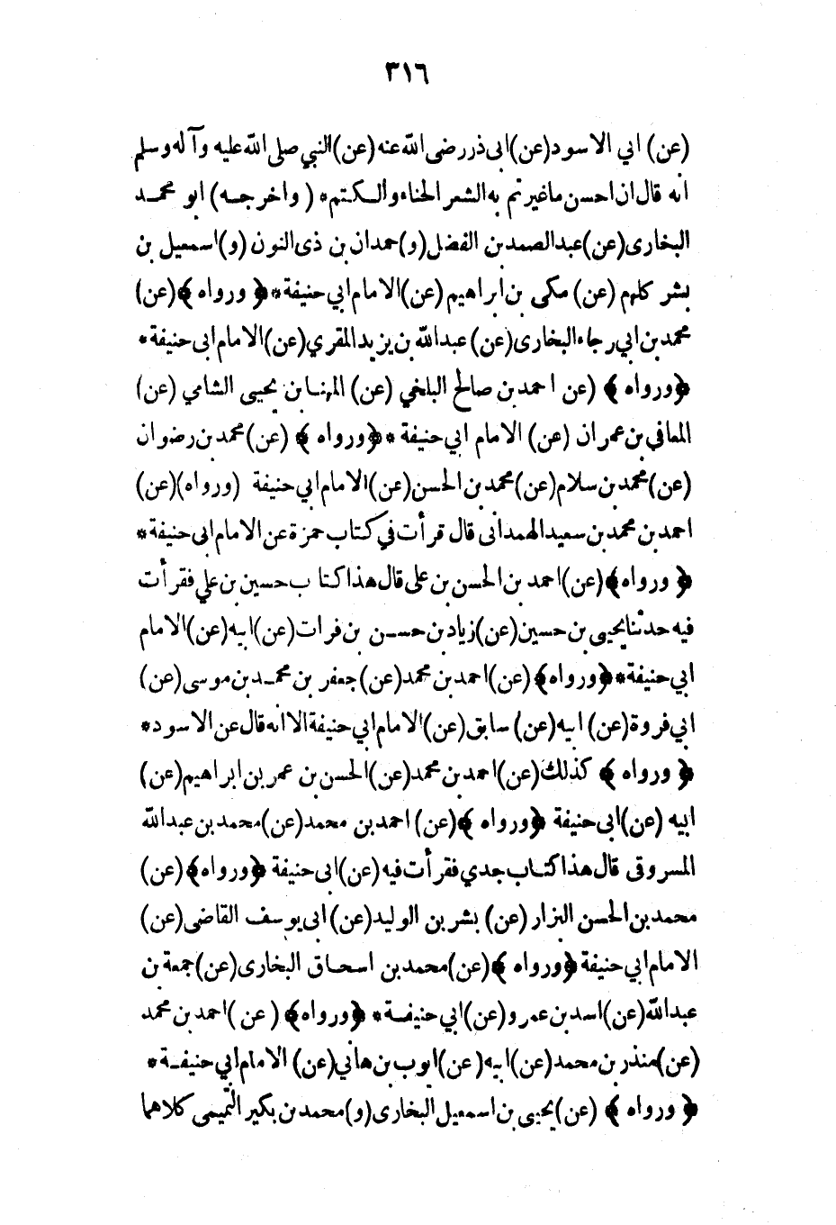 (عن) أبي الأسود (عن) أبي ذر رضي الله عنه (عن) النبي صلى الله عليه وآله وسلم أنه قال إن أحسن ما غيرتم به الشعر الحناء والكتم* (وأخرجه) أبو محمد البخاري (عن) عبد الصمد بن الفضل (و) حمدان بن ذي النون (و) إسماعيل بن بشر كلهم (عن) مكي بن إبراهيم (عن) الإمام أبي حنيفة* (ورواه) (عن) محمد بن أبي رجاء البخاري (عن) عبد الله بن يزيد المقري (عن) الإمام أبي حنيفة* (ورواه) (عن) أحمد بن صالح البلخي (عن) المهنا بن يحيى الشامي (عن) المعافى بن عمران (عن) الإمام أبي حنيفة* (ورواه) (عن) محمد بن رضوان (عن) محمد بن سلام (عن) محمد بن الحسن (عن) الإمام أبي حنيفة (ورواه) (عن) أحمد بن محمد بن سعيد الهمداني قال قرأت في كتاب حمزة عن الإمام أبي حنيفة* (ورواه) (عن) أحمد بن الحسن بن علي قال هذا كتاب حسين بن علي فقرأت فيه حدثنا يحيى بن حسين (عن) زياد بن حسن بن فرات (عن) أبيه (عن) الإمام أبي حنيفة* (ورواه) (عن) أحمد بن محمد (عن) جعفر بن محمد بن موسى (عن) أبي فروة (عن) أبيه (عن) سابق (عن) الإمام أبي حنيفة إلا أنه قال عن الأسود* (ورواه) كذلك (عن) أحمد بن محمد (عن) الحسن بن عمر بن إبراهيم (عن) أبيه (عن) أبي حنيفة (ورواه) (عن) أحمد بن محمد (عن) محمد بن عبد الله المسروقي قال هذا كتاب جدي فقرأت فيه (عن) أبي حنيفة (ورواه) (عن) محمد بن الحسن البزار (عن) بشر بن الوليد (عن) أبي يوسف القاضي (عن) الإمام أبي حنيفة (ورواه) (عن) محمد بن إسحاق البخاري (عن) جمعة بن عبد الله (عن) أسد بن عمرو (عن) أبي حنيفة* (ورواه) (عن) أحمد بن محمد (عن) منذر بن محمد (عن) أبيه (عن) أيوب بن هاني (عن) الإمام أبي حنيفة* (ورواه) (عن) يحيى بن إسماعيل البخاري (و) محمد بن بكير التميمي كلاهما