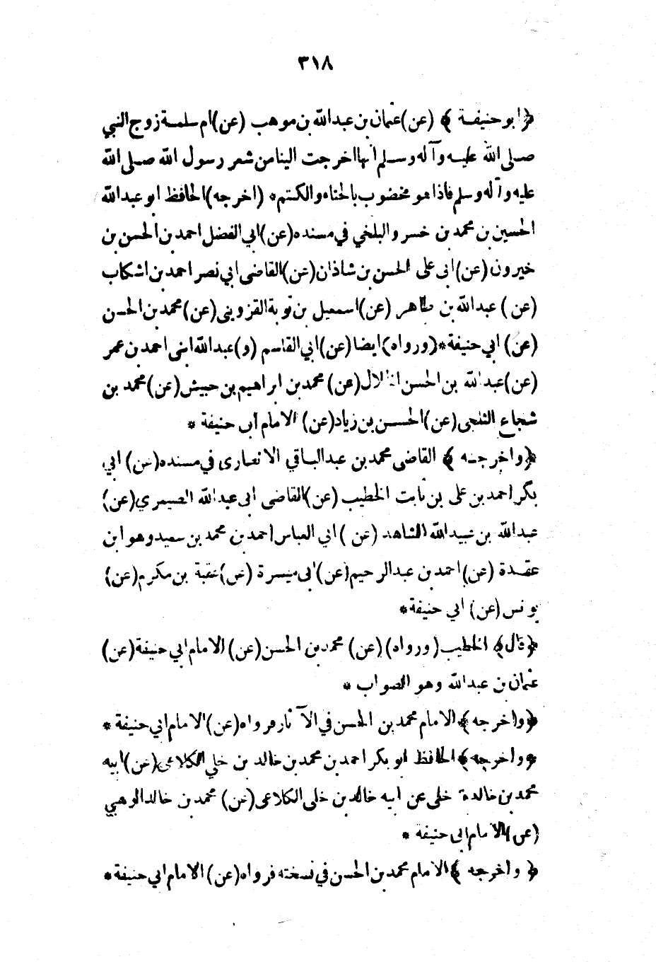 (أبو حنيفة) (عن) عثمان بن عبد الله بن موهب (عن) أم سلمة زوج النبي صلى الله عليه وآله وسلم أنها خرجت إلينا من شعر رسول الله صلى الله عليه وآله وسلم فإذا هو مخضوب بالحناء والكتم* (أخرجه) الحافظ أبو عبد الله الحسين بن محمد بن خسرو البلخي في مسنده (عن) أبي الفضل أحمد بن الحسن بن خيرون (عن) أبي علي الحسن بن شاذان (عن) القاضي أبي نصر أحمد بن اشكاب (عن) عبد الله بن طاهر (عن) إسماعيل بن توبة القزويني (عن) محمد بن الحسن (عن) أبي حنيفة* (ورواه) أيضاً (عن) أبي القاسم (و) عبد الله ابني أحمد بن عمر (عن) عبد الله بن الحسن الخلال (عن) محمد بن حبيش (عن) محمد بن شجاع الثلجي (عن) الحسن بن زياد (عن) الإمام أبي حنيفة*