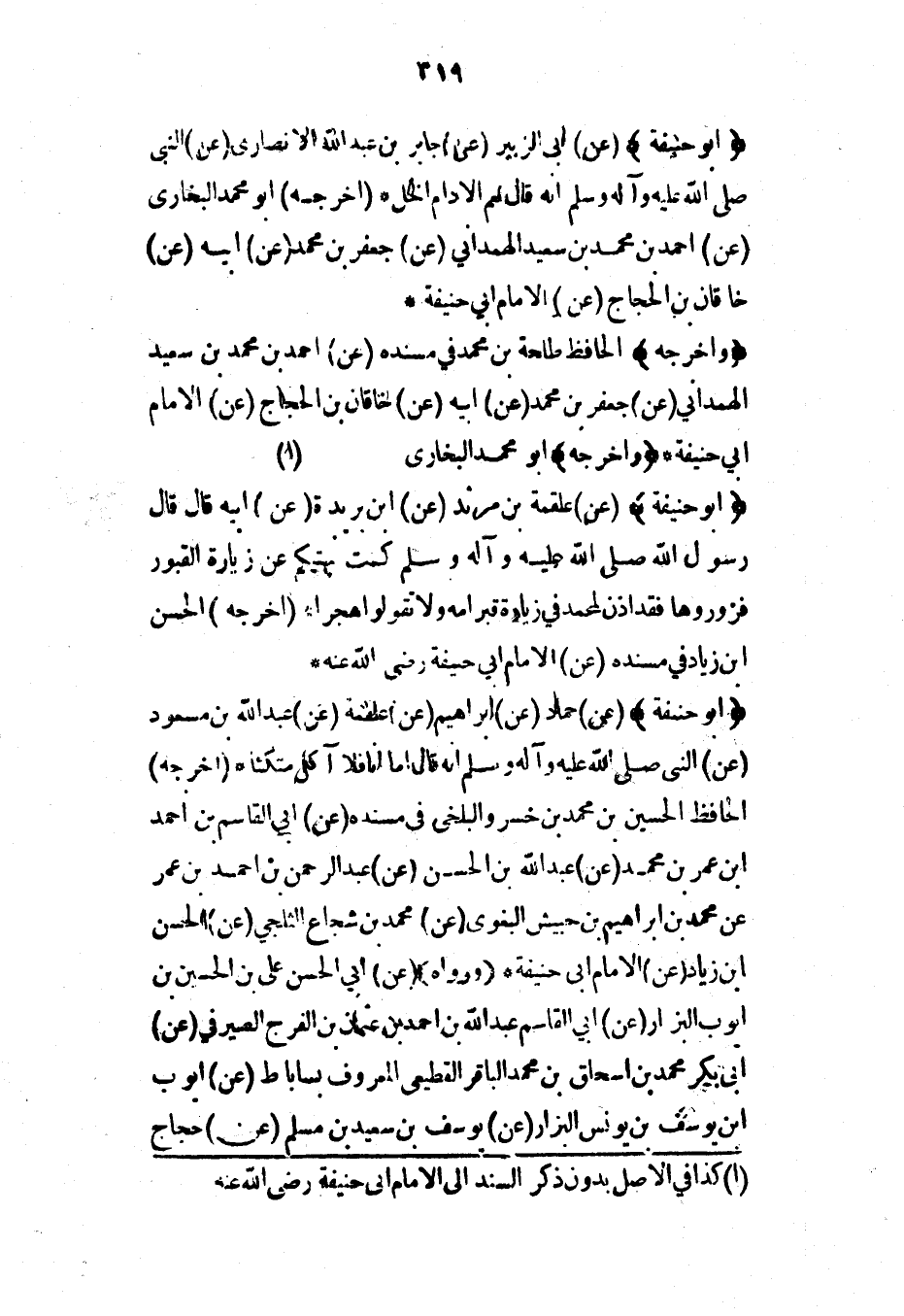 (وأخرجه) الحافظ طلحة بن محمد في مسنده (عن) أحمد بن محمد بن سعيد الهمداني (عن) جعفر بن محمد (عن) أبيه (عن) خاقان بن الحجاج (عن) الإمام أبي حنيفة* (وأخرجه) أبو محمد البخاري*