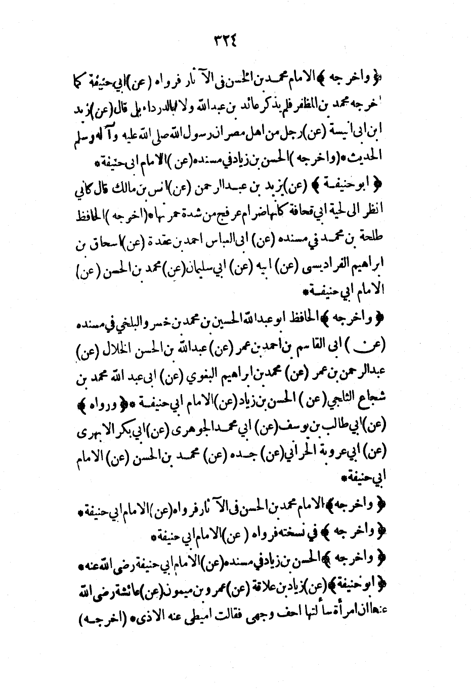 (وأخرجه) الحافظ أبو عبد الله الحسين بن محمد بن خسرو البلخي في مسنده (عن) أبي القاسم بن أحمد بن عمر (عن) عبد الله بن الحسن الخلال (عن) عبد الرحمن بن عمر (عن) محمد بن إبراهيم البغوي (عن) أبي عبد الله محمد بن شجاع الثلجي (عن) الحسن بن زياد (عن) الإمام أبي حنيفة* (ورواه) (عن) أبي طالب بن يوسف (عن) أبي محمد الجوهري (عن) أبي بكر الأبهري (عن) أبي عروبة الحراني (عن) جده (عن) محمد بن الحسن (عن) الإمام أبي حنيفة*