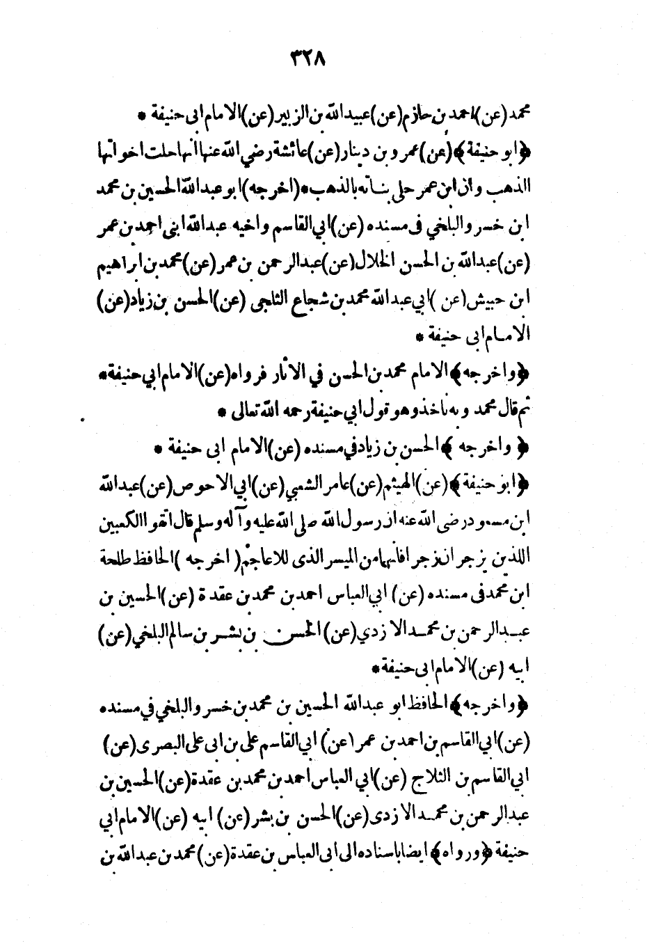 (أبو حنيفة) (عن) عمرو بن دينار (عن) عائشة رضي الله عنها أنها حلت أخواتها الذهب وأن ابن عمر حلى بناته الذهب* (أخرجه) أبو عبد الله الحسين بن محمد ابن خسرو البلخي في مسنده (عن) أبي القاسم وأخيه عبد الله ابني أحمد بن عمر (عن) عبد الله بن الحسن الخلال (عن) عبد الرحمن بن عمر (عن) محمد بن إبراهيم ابن حبيش (عن) أبي عبد الله محمد بن شجاع الثلجي (عن) الحسن بن زياد (عن) الإمام أبي حنيفة*