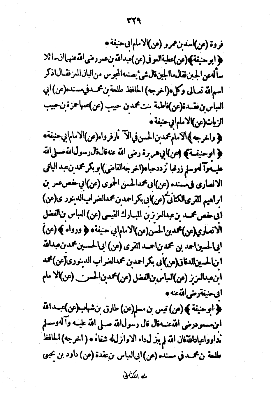 (أبو حنيفة) (عن) قيس بن مسلم (عن) طارق بن شهاب (عن) عبد الله ابن مسعود رضي الله عنه قال قال رسول الله صلى الله عليه وآله وسلم تداووا عباد الله فإن الله لم ينزل داء إلا وأنزل له شفاء* (أخرجه) الحافظ طلحة بن محمد في مسنده (عن) أبي العباس بن عقدة (عن) داود بن يحيى
