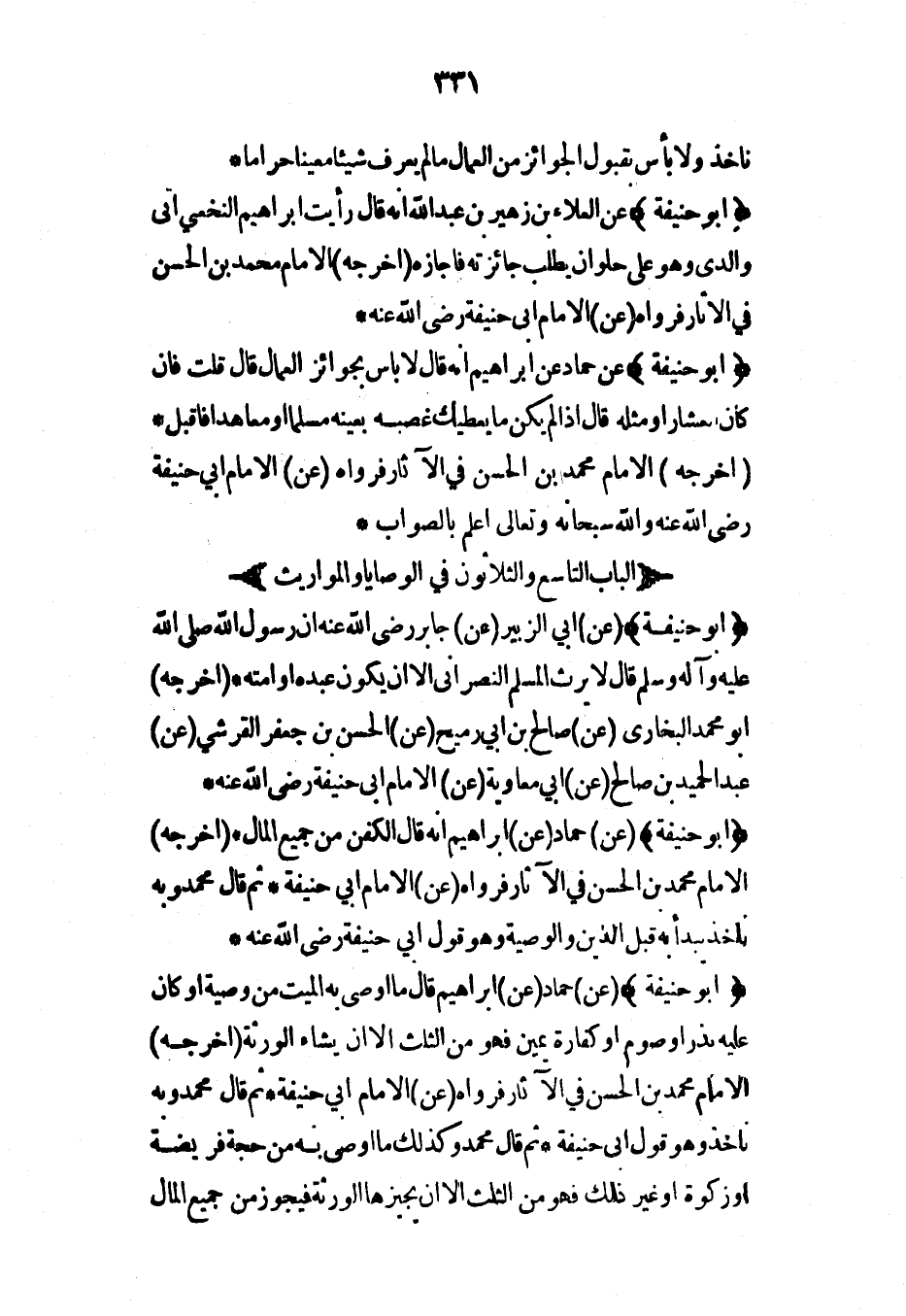 (أبو حنيفة) (عن) أبي الزبير (عن) جابر رضي الله عنه أن رسول الله صلى الله عليه وآله وسلم قال لا يرث المسلم النصراني إلا أن يكون عبده أو أمته* (أخرجه) أبو محمد البخاري (عن) صالح بن أبي رميح (عن) الحسن بن جعفر القرشي (عن) عبد الحميد بن صالح (عن) أبي معاوية (عن) الإمام أبي حنيفة رضي الله عنه*