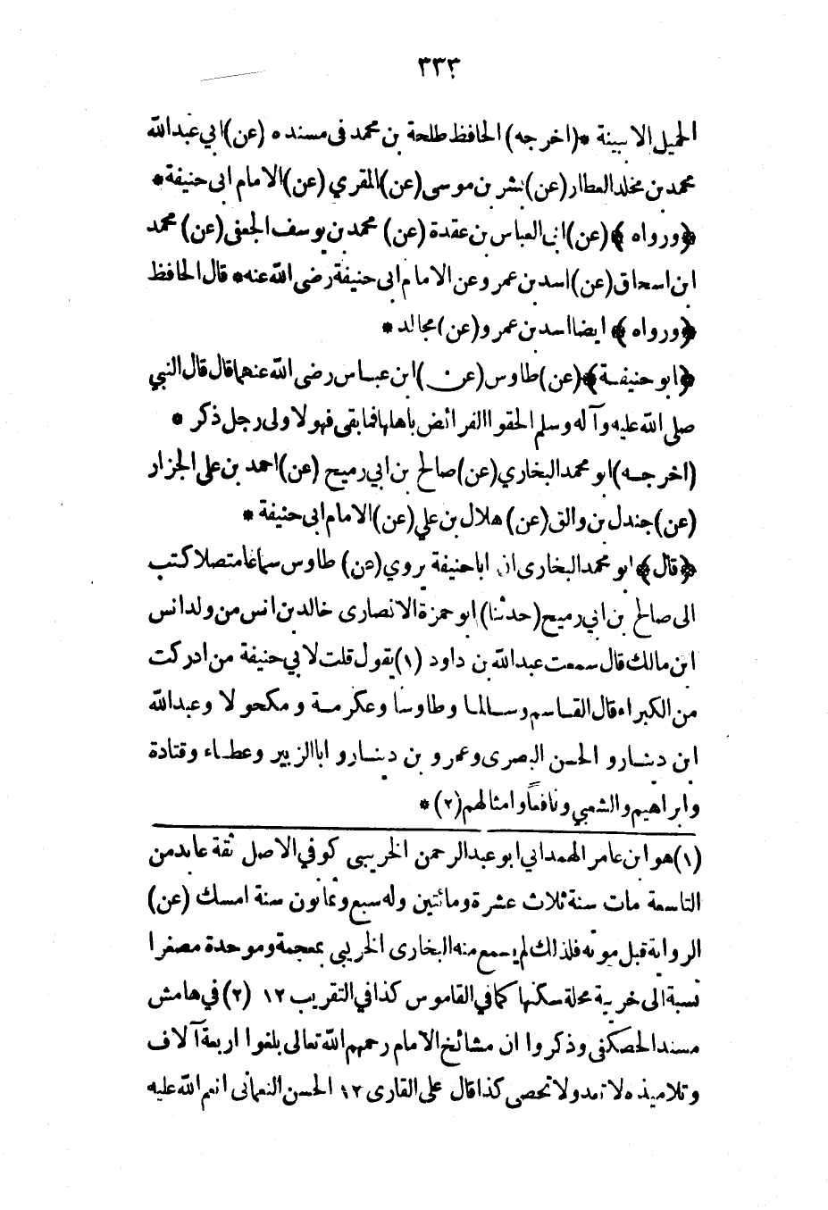 (قال) أبو محمد البخاري أن أبا حنيفة يروي (عن) طاوس سماعاً متصلا كتب إلى صالح بن أبي رميح (حدثنا) أبو حمزة الأنصاري خالد بن أنس من ولد أنس ابن مالك قال سمعت عبد الله بن داود يقول قلت لأبي حنيفة من أدركت من الكبراء قال القاسم وسالماً وطاوساً وعكرمة ومكحولاً وعبد الله ابن دينار والحسن البصري وعمرو بن دينار وأبا الزبير وعطاء وقتادة وإبراهيم والشعبي ونافعاً وأمثالهم*