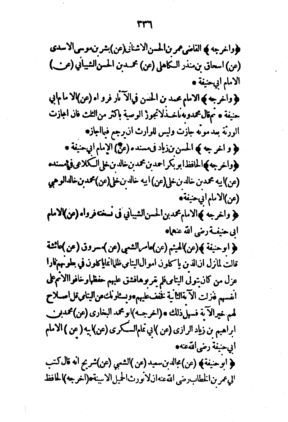 (أبو حنيفة) (عن) الهيثم (عن) عامر الشعبي (عن) مسروق (عن) عائشة قالت لما نزل {إن الذين يأكلون أموال اليتامى ظلماً إنما يأكلون في بطونهم ناراً} عزل من كان يتولى اليتامى فلم يقربوها فشق عليهم حفظها وخافوا الإثم على أنفسهم فنزلت الآية الثانية فخفف عليهم* {ويسئلونك عن اليتامى قل إصلاحٌ لهم خير} الآية فسهل ذلك* (أخرجه) أبو محمد البخاري (عن) محمد ابن إبراهيم بن زياد الرازي (عن) أبي تمام السكري (عن) أبيه (عن) الإمام أبي حنيفة رضي الله عنه*
