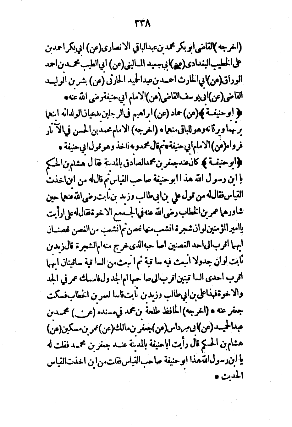 (أبو حنيفة) كان عند جعفر بن محمد الصادق بالمدينة فقال هشام بن الحكم يا ابن رسول الله هذا أبو حنيفة صاحب القياس ثم قال له من أين أخذت القياس فقال له من قول علي بن أبي طالب وزيد بن ثابت رضي الله عنهما حين شاورهما عمر بن الخطاب رضي الله عنه في الجد مع الأخوة فقال له علي أرأيت يا أمير المؤمنين لو أن شجرة انشعب منها غصن ثم انشعب من الغصن غصنان أيهما أقرب إلى أحد الغصنين أصاحبه الذي خرج منه أم الشجرة قال زيد بن ثابت لو أن جدولاً انبعث فيه ساقية ثم انبعث من الساقية ساقيتان أيهما أقرب إحدى الساقيتين أقرب إلى صاحبها أم الجدول فأمسك عمر في الجد والأخوة فهذا علي بن أبي طالب وزيد بن ثابت قاسا لعمر بن الخطاب فسكت جعفر عنه* (أخرجه) الحافظ طلحة بن محمد في مسنده (عن) محمد بن عبد الحميد (عن) أبي مرداس (عن) جعفر بن مالك (عن) عمر بن مسكين (عن) هشام بن الحكم قال رأيت أبا حنيفة بالمدينة عند جعفر بن محمد فقلت له يا ابن رسول الله هذا أبو حنيفة صاحب القياس فقلت من أين أخذت القياس الحديث*