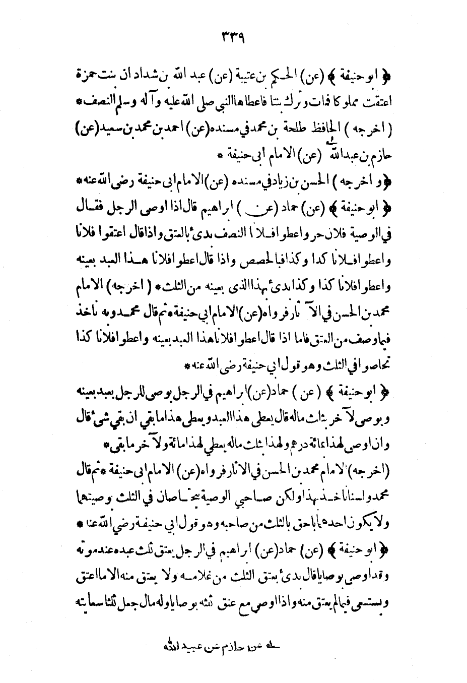 (أبو حنيفة) (عن) الحكم بن عتيبة (عن) عبد الله بن شداد أن بنت حمزة أعتقت مملوكاً فمات وترك بنتاً فأعطاها النبي صلى الله عليه وآله وسلم النصف* (أخرجه) الحافظ طلحة بن محمد في مسنده (عن) أحمد بن محمد بن سعيد (عن) حازم بن عبد الله (عن) الإمام أبي حنيفة*