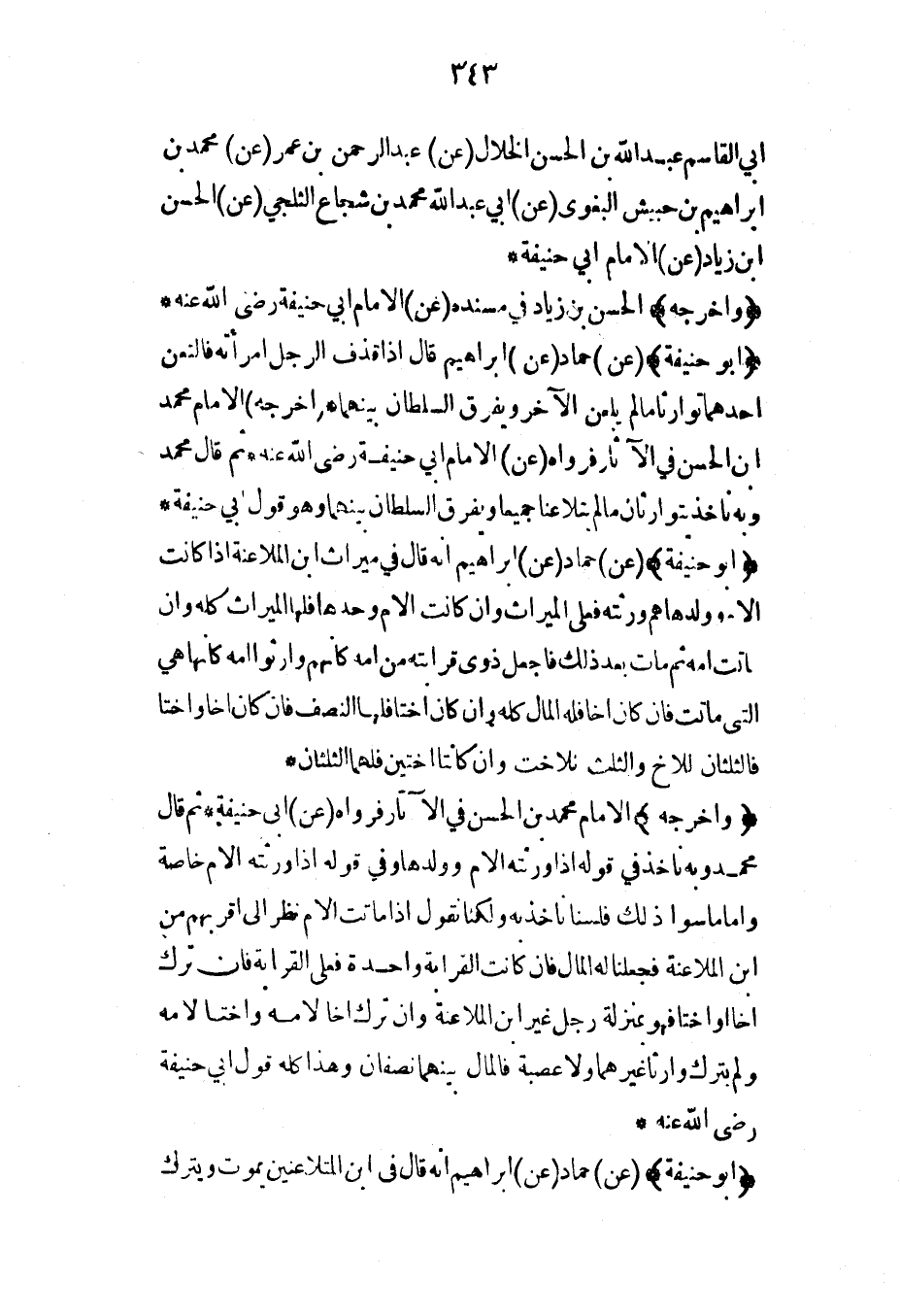 أبي القاسم عبد الله بن الحسن الخلال (عن) عبد الرحمن بن عمر (عن) محمد بن إبراهيم بن حبيش البغوي (عن) أبي عبد الله محمد بن شجاع الثلجي (عن) الحسن ابن زياد (عن) الإمام أبي حنيفة*