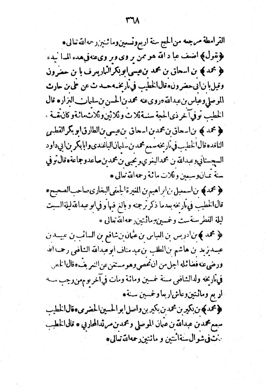 (محمد) بن إسحاق بن محمد بن إسحاق بن عيسى بن الطارق أبو بكر القطيعي الناقد* قال الخطيب في تاريخه سمع محمد بن سليمان الباغندي وأبا بكر بن أبي داود السجستاني وعبد الله بن محمد البغوي ويحيى بن محمد بن صاعد وجماعة* قال توفي سنة ثمان وسبعين وثلاث مائة رحمه الله تعالى*