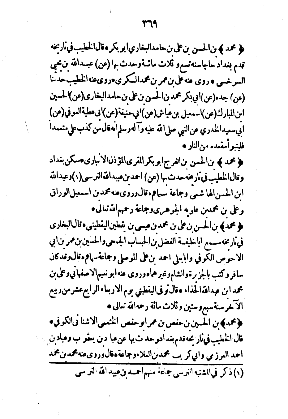 (محمد) بن الحسن بن علي بن حامد البخاري أبو بكر* قال الخطيب في تاريخه قدم بغداد حاجاً سنة تسع وثلاث مائة وحدث بها (عن) عبد الله بن يحيى السرخسي* روى عنه علي بن عمر بن محمد السكري* روى عنه الخطيب حدثنا (عن) جده (عن) أبي بكر محمد بن الحسن بن علي بن حامد البخاري (عن) الحسين ابن المبارك (عن) إسماعيل بن عياش (عن) أبي حنيفة (عن) أبي عطية العوفي (عن) أبي سعيد الخدري عن النبي صلى الله عليه وآله وسلم أنه قال من كذب علي متعمداً فليتبوأ مقعده من النار*