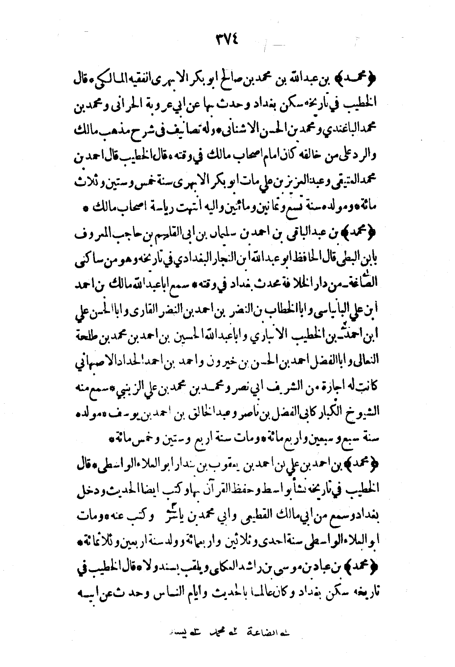 (محمد) بن عبد الباقي بن أحمد بن سليمان بن أبي القاسم بن حاجب المعروف بابن البطي قال الحافظ أبو عبد الله ابن النجار البغدادي في تاريخه وهو من ساكني الصاغة - من دار الخلافة محدث بغداد في وقته* سمع أبا عبد الله مالك بن أحمد ابن علي البانياسي وأبا الخطاب بن النضر بن أحمد بن النضر القاري وأبا الحسن علي ابن أحمد بن الخطيب الأنباري وأبا عبد الله الحسين بن أحمد بن محمد بن طلحة النعالي وأبا الفضل أحمد بن الحسن بن خيرون وأحمد بن أحمد الحداد الأصبهاني كانت له إجازة من الشريف أبي نصر ومحمد بن محمد بن علي الزينبي* سمع منه الشيوخ الكبار كأبي الفضل بن ناصر وعبد الخالق بن أحمد بن يوسف* مولده سنة سبع وسبعين وأربع مائة* ومات سنة أربع وستين وخمس مائة*