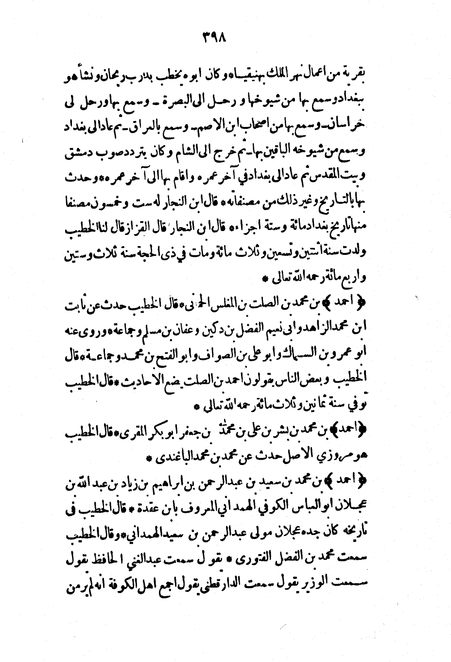 بقرية من أعمال نهر الملك بهنيقيا* وكان أبوه يخطب بدرب ريحان ونشأ هو ببغداد وسمع بها من شيوخها ورحل إلى البصرة -وسمع بها ورحل إلى خراسان- وسمع بها من أصحاب ابن الأصم وسمع بالعراق- ثم عاد إلى بغداد وسمع من شيوخه الباقين بها- ثم خرج إلى الشام وكان يتردد صوب دمشق وبيت المقدس ثم عاد إلى بغداد في آخر عمره وأقام بها إلى آخر عمره* وحدث بها بالتاريخ وغير ذلك من مصنفاته* قال ابن النجار له ست وخمسون مصنفاً منها تاريخ بغداد مائة وستة أجزاء* قال ابن النجار قال القزاز قال لنا الخطيب ولدت سنة اثنتين وتسعين وثلاث مائة ومات في ذي الحجة سنة ثلاث وستين وأربع مائة رحمه الله تعالى*