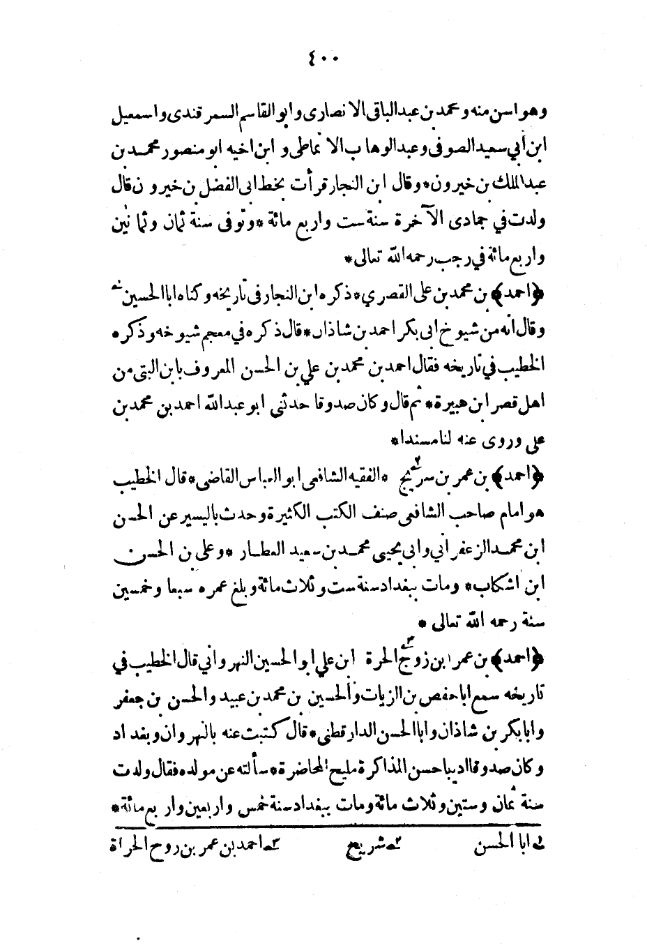 (أحمد) بن محمد بن علي القصري* ذكره ابن النجار في تاريخه وكناه أبا الحسين وقال أنه من شيوخ أبي بكر أحمد بن شاذان* قال ذكره في معجم شيوخه وذكره الخطيب في تاريخه فقال أحمد بن محمد بن علي بن الحسن المعروف بابن البتي من أهل قصر ابن هبيرة* ثم قال وكان صدوقاً حدثني أبو عبد الله أحمد بن محمد بن علي وروى عنه لنا مسنداً*