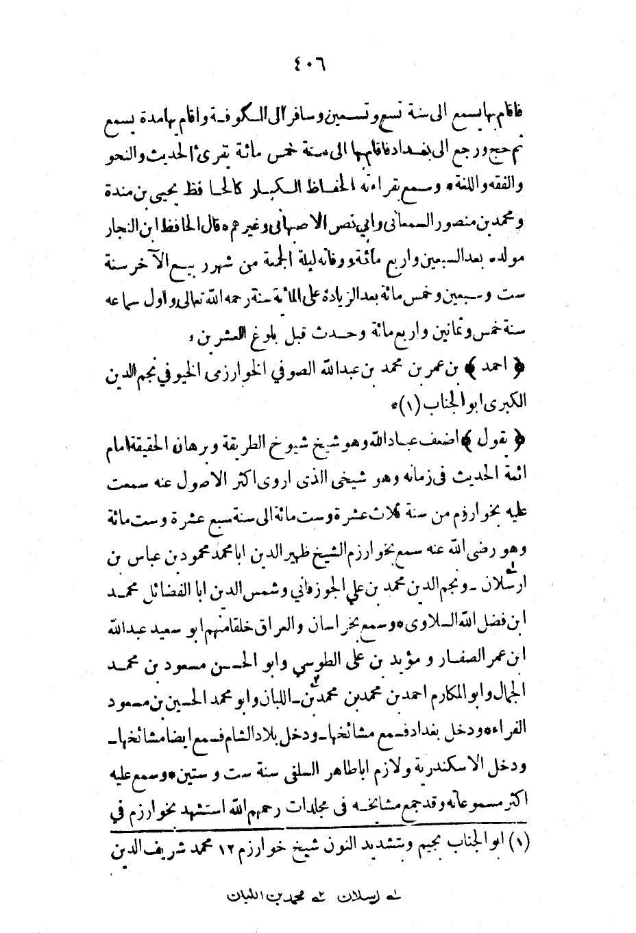 (يقول) أضعف عباد الله وهو شيخ شيوخ الطريقة وبرهان الحقيقة إمام أئمة الحديث في زمانه وهو شيخي الذي أروي أكثر الأصول عنه سمعت عليه بخوارزم من سنة ثلاث عشرة وست مائة إلى سنة سبع عشرة وست مائة وهو رضي الله عنه سمع بخوارزم الشيخ ظهير الدين أبا محمد محمود بن عباس بن أرسلان – ونجم الدين محمد بن علي الجوزقاني وشمس الدين أبا الفضائل محمد ابن فضل الله السلاوي* وسمع بخراسان والعراق خلقاً منهم أبو سعيد عبد الله ابن عمر الصفار ومؤيد بن علي الطوسي وأبو الحسن مسعود بن محمد الجمال وأبو المكارم أحمد بن محمد بن محمد بن اللبان وأبو محمد الحسين بن مسعود الفراء* ودخل بغداد فسمع مشائخها- ودخل بلاد الشام فسمع أيضاً مشائخها- ودخل الإسكندرية ولازم أبا طاهر السلفي سنة ست وستين* وسمع عليه أكثر مسموعاته وقد جمع مشايخه في مجلدات رحمهم الله استشهد بخوارزم في