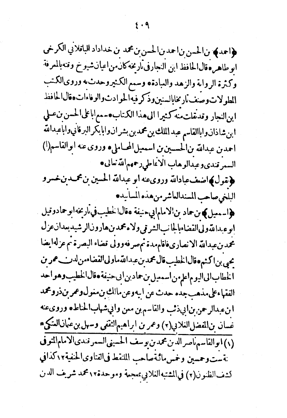 (إسماعيل) بن حماد بن الإمام أبي حنيفة قال الخطيب في تاريخه أبو حماد وقيل أبو عبد الله ولي القضاء بالجانب الشرقي ولاه محمد بن هارون الرشيد بعد أن عزل محمد بن عبد الله الأنصاري فأقام مدة ثم صرفه وولي قضاء البصرة ثم عزله أيضاً يحيى بن أكثم* قال الخطيب قال محمد بن عبد الله ما ولي القضاء من لدن عمر بن الخطاب إلى اليوم أعلم من إسماعيل بن حماد بن أبي حنيفة* قال الخطيب وهو أحد الفقهاء على مذهب جده حدث عن أبيه وعن مالك بن مغول وعمر بن ذر ومحمد ابن عبد الرحمن بن أبي ذئب والقاسم بن معن وأبي شهاب الحناط* وروى عنه غسان بن المفضل الغلابي وعمر بن إبراهيم الثقفي وسهل بن عثمان العتكي*