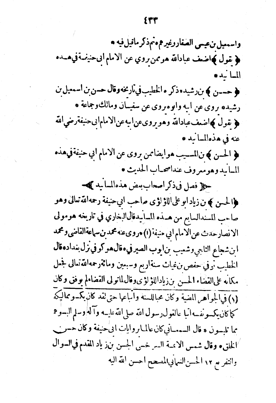(الحسن) بن زياد أبو علي اللؤلؤي صاحب أبي حنيفة رحمه الله تعالى وهو صاحب المسند السابع من هذه المسانيد قال البخاري في تاريخه هو مولى الأنصار حدث عن الإمام أبي حنيفة* روى عنه محمد بن سماعة القاضي ومحمد ابن شجاع الثلجي وشعيب بن أيوب الصيرفي* قال هو كوفي نزل بغداد* قال الخطيب توفي حفص بن غياث سنة أربع وسبعين ومائة رحمه الله تعالى فجعل مكانه على القضاء الحسن بن زياد اللؤلؤي وقال لما تولى القضاء لم يوفق وكان