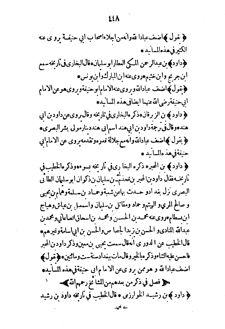 (خلاد) بن يحيى* قال البخاري في تاريخه خلاد بن يحيى أبو محمد كوفي سمع مسعر أو الثوري سكن مكة ومات بها قريباً من ثلاث عشرة ومائتين* (يقول) أضعف عباد الله وهو يروي عن أصحاب أبي حنيفة في هذه المسانيد*