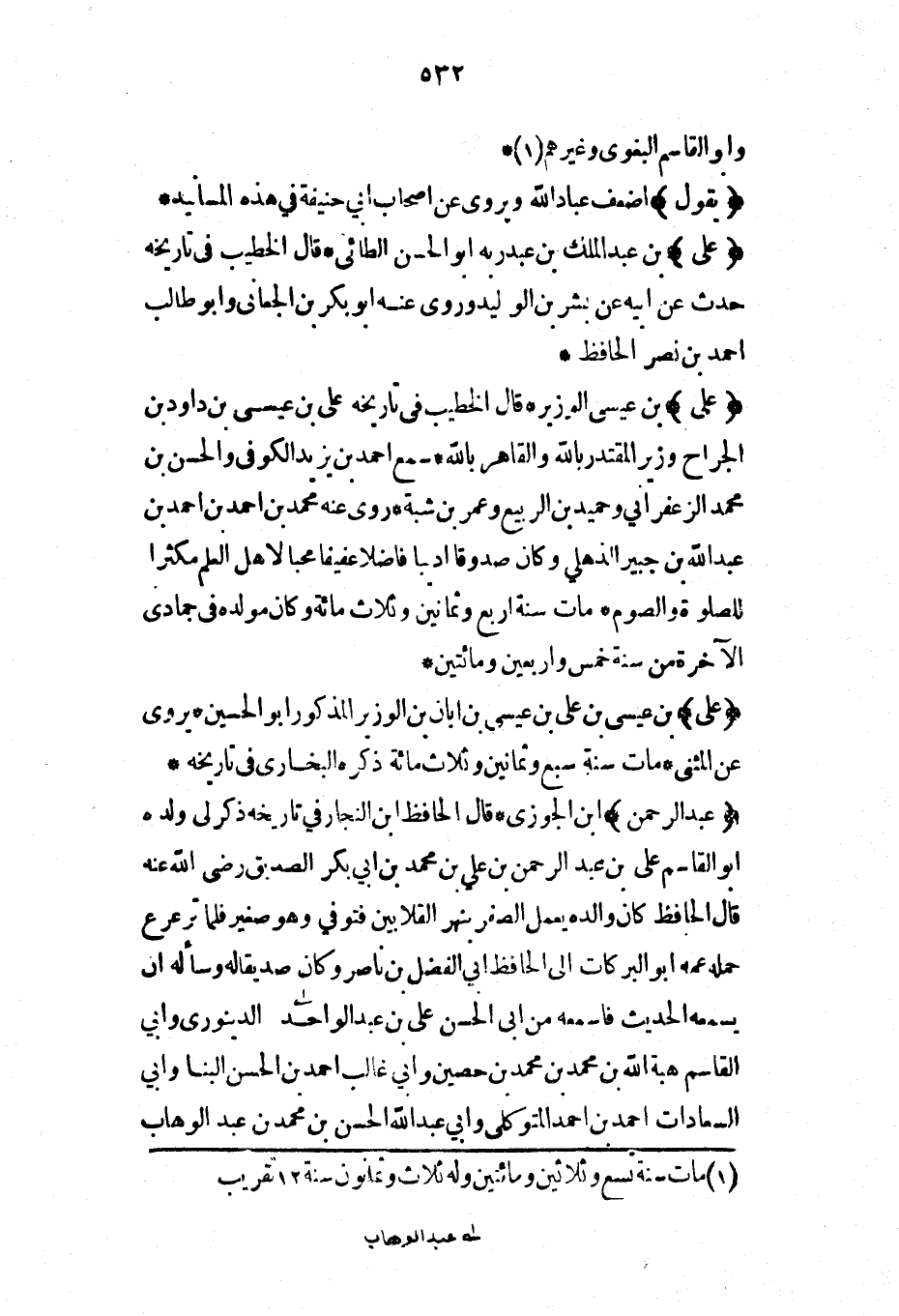 عبد الله أبو الحسن الدارقطني* قال الخطيب سمع أبا القاسم البغوي وأبا بكر بن أبي داود ومحمد بن محمد بن صاعد وبدر بن الهيثم القاضي وأحمد بن إسحاق بن بهلول وعبد الوهاب ابن أخيه والفضل بن أحمد وخلقاً كثيراً روى عنه أبو نعيم الحافظ الأصفهاني وأبو بكر البرقاني الخوارزمي وأبو القاسم بن بشران والعتيقي وأبو طاهر القاضي الطبري وجماعة* قال الخطيب هو وحيد دهره وفريد عصره وإمام وقته انتهى إليه معرفة الحديث وعلله وأسماء الرجال وأحوال الرواة والاطلاع بعلم سوى علم الحديث* مات سنة خمس وثمانين وثلاث مائة ومولده سنة خمس وثلاث مائة*
