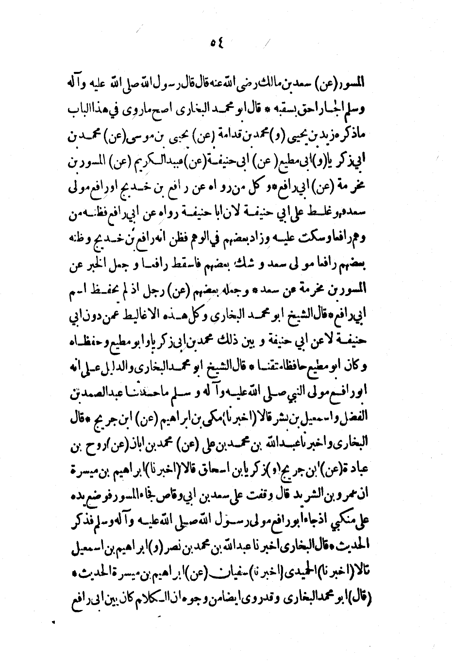 المسور (عن) سعد بن مالك رضي الله عنه قال قال رسول الله صلى الله عليه وآله وسلم الجار أحق بسقبه* قال أبو محمد البخاري أصح ما روى في هذا الباب ما ذكره زيد بن يحيى (و) محمد بن قدامة (عن) يحيى بن موسى (عن) محمد بن أبي زكريا (و) أبي مطيع (عن) أبي حنيفة (عن) عبد الكريم (عن) المسور بن مخرمة (عن) أبي رافع* وكل من رواه عن رافع بن خديج أو رافع مولى سعد فهو غلط على أبي حنيفة لأن أبا حنيفة رواه عن أبي رافع فظنه من وهم رافعاً وسكت عليه وزاد بعضهم في الوهم فظن أنه رافع بن خديج وظنه بعضهم رافعاً مولى سعد وشك بعضهم فأسقط رافعاً وجعل الخبر عن المسور بن مخرمة عن سعد* وجعله بعضهم (عن) رجل إذ لم يحفظ اسم أبي رافع* قال الشيخ أبو محمد البخاري وكل هذه الأغاليط عمن دون أبي حنيفة لا عن أبي حنيفة وبين ذلك محمد بن أبي زكريا وأبو مطيع وحفظاه وكان أبو مطيع حافظاً متقناً* قال الشيخ أبو محمد البخاري والدليل على أنه أبو رافع مولى النبي صلى الله عليه وآله وسلم ما حدثنا عبد الصمد بن الفضل وإسماعيل بن بشر قالا (أخبرنا) مكي بن إبراهيم (عن) ابن جريج* قال البخاري وأخبرنا عبد الله بن محمد بن علي (عن) محمد بن أبان (عن) روح بن عبادة (عن) ابن جريج (و) زكريا بن إسحاق قالا (أخبرنا) إبراهيم بن ميسرة أن عمرو بن الشريد قال وقفت على سعد بن أبي وقاص فجاء المسور فوضع يده على منكبي إذ جاء أبو رافع مولى رسول الله صلى الله عليه وآله وسلم فذكر الحديث* قال البخاري أخبرنا عبد الله بن محمد بن نصر (و) إبراهيم بن إسماعيل قالا (أخبرنا) الحميدي (أخبرنا) سفيان (عن) إبراهيم بن ميسرة الحديث* (قال) أبو محمد البخاري وقد روي أيضاً من وجوه أن الكلام كان بين أبي رافع