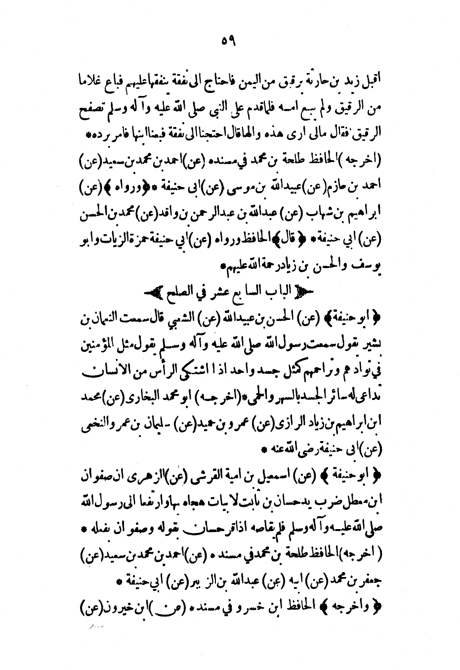 (أبو حنيفة) (عن) إسماعيل بن أمية القرشي (عن) الزهري أن صفوان ابن معطل ضرب يد حسان بن ثابت لأبيات هجاه بها وارتفعا إلى رسول الله صلى الله عليه وآله وسلم فلم يقاصه إذ أقر حسان بقوله وصفوان بفعله* (أخرجه) الحافظ طلحة بن محمد في مسنده (عن) أحمد بن محمد بن سعيد (عن) جعفر بن محمد (عن) أبيه (عن) عبد الله بن الزبير (عن) أبي حنيفة*