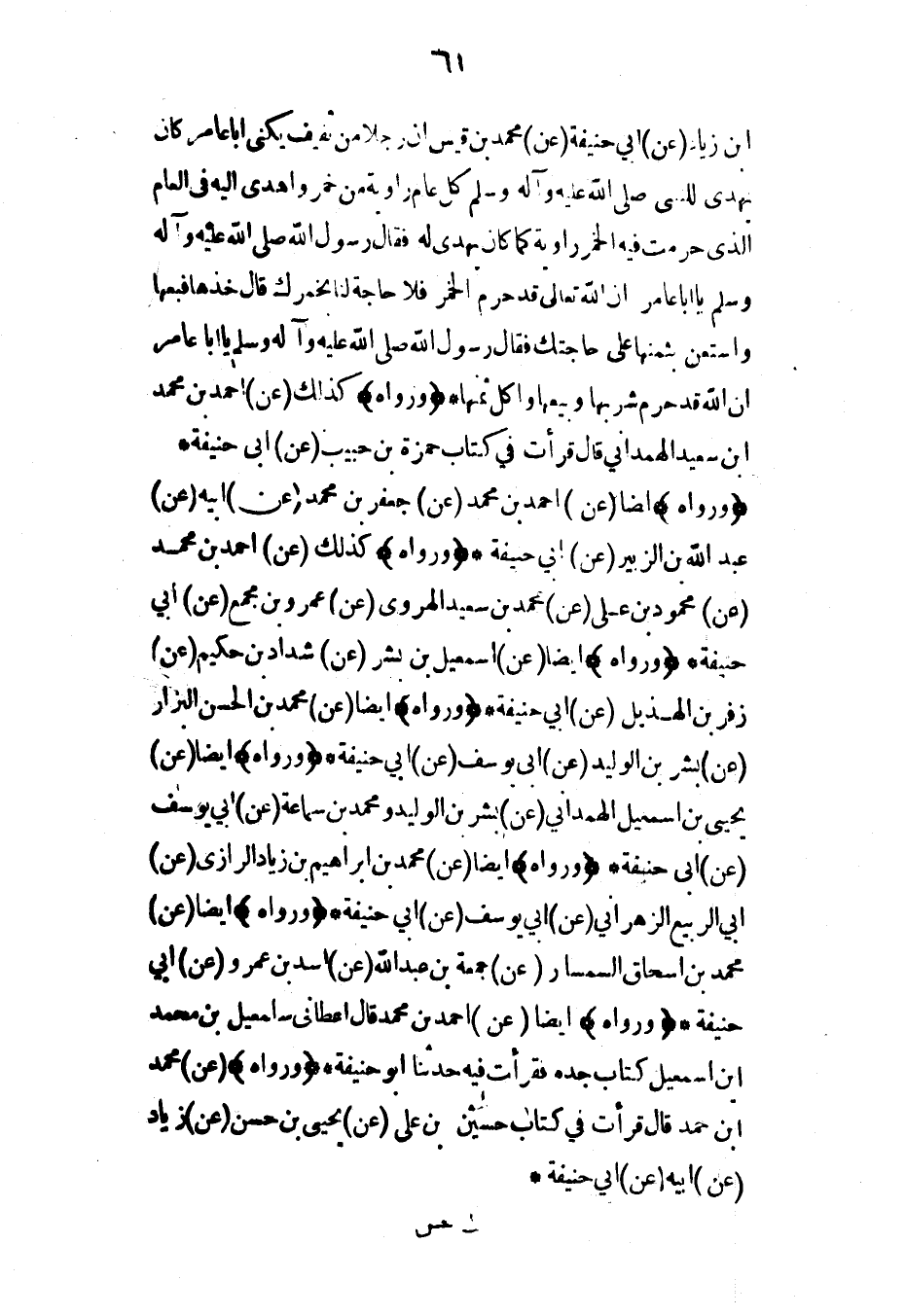 (ورواه) أيضاً (عن) أحمد بن محمد (عن) جعفر بن محمد (عن) أبيه (عن) عبد الله بن الزبير (عن) أبي حنيفة* (ورواه) كذلك (عن) أحمد بن محمد (عن) محمود بن علي (عن) محمد بن سعيد الهروي (عن) عمرو بن مجمع (عن) أبي حنيفة* (ورواه) أيضاً (عن) إسماعيل بن بشر (عن) شداد بن حكيم (عن) زفر بن الهذيل (عن) أبي حنيفة* (ورواه) أيضاً (عن) محمد بن الحسن البزار (عن) بشر بن الوليد (عن) أبي يوسف (عن) أبي حنيفة* (ورواه) أيضاً (عن) يحيى بن إسماعيل الهمداني (عن) بشر بن الوليد ومحمد بن سماعة (عن) أبي يوسف (عن) أبي حنيفة* (ورواه) أيضاً (عن) محمد بن إبراهيم بن زياد الرازي (عن) أبي الربيع الزهراني (عن) أبي يوسف (عن) أبي حنيفة* (ورواه) أيضاً (عن) محمد بن إسحاق السمسار (عن) جمعة بن عبد الله (عن) أسد بن عمرو (عن) أبي حنيفة* (ورواه) أيضاً (عن) أحمد بن محمد قال أعطاني إسماعيل بن محمد ابن إسماعيل كتاب جده فقرأت فيه حدثنا أبو حنيفة* (ورواه) (عن) محمد ابن حمد قال قرأت في كتاب حسين بن علي (عن) يحيى بن حسن (عن) زياد (عن) أبيه (عن) أبي حنيفة*