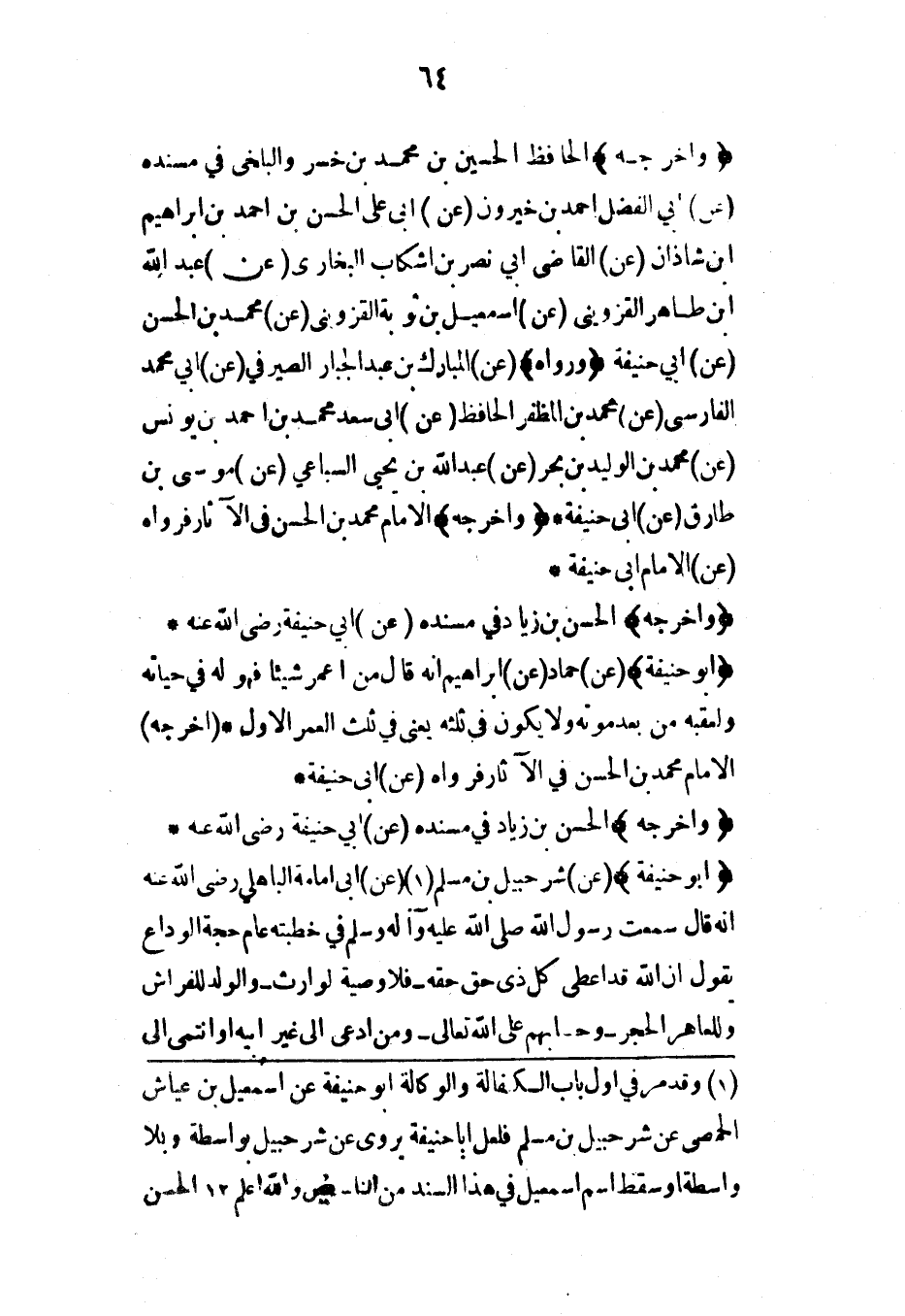 (وأخرجه) الحافظ الحسين بن محمد بن خسرو البلخي في مسنده (عن) أبي الفضل أحمد بن خيرون (عن) أبي علي الحسن بن أحمد بن إبراهيم ابن شاذان (عن) القاضي أبي نصر بن اشكاب البخاري (عن) عبد الله ابن طاهر القزويني (عن) إسماعيل بن ثوبة القزويني (عن) محمد بن الحسن (عن) أبي حنيفة (ورواه) (عن) المبارك بن عبد الجبار الصيرفي (عن) أبي محمد الفارسي (عن) محمد بن المظفر الحافظ (عن) أبي سعد محمد بن أحمد بن يونس (عن) محمد بن الوليد بن بحر (عن) عبد الله بن يحيى السباعي (عن) موسى بن طارق (عن) أبي حنيفة* (وأخرجه) الإمام محمد بن الحسن في الآثار فرواه (عن) الإمام أبي حنيفة*