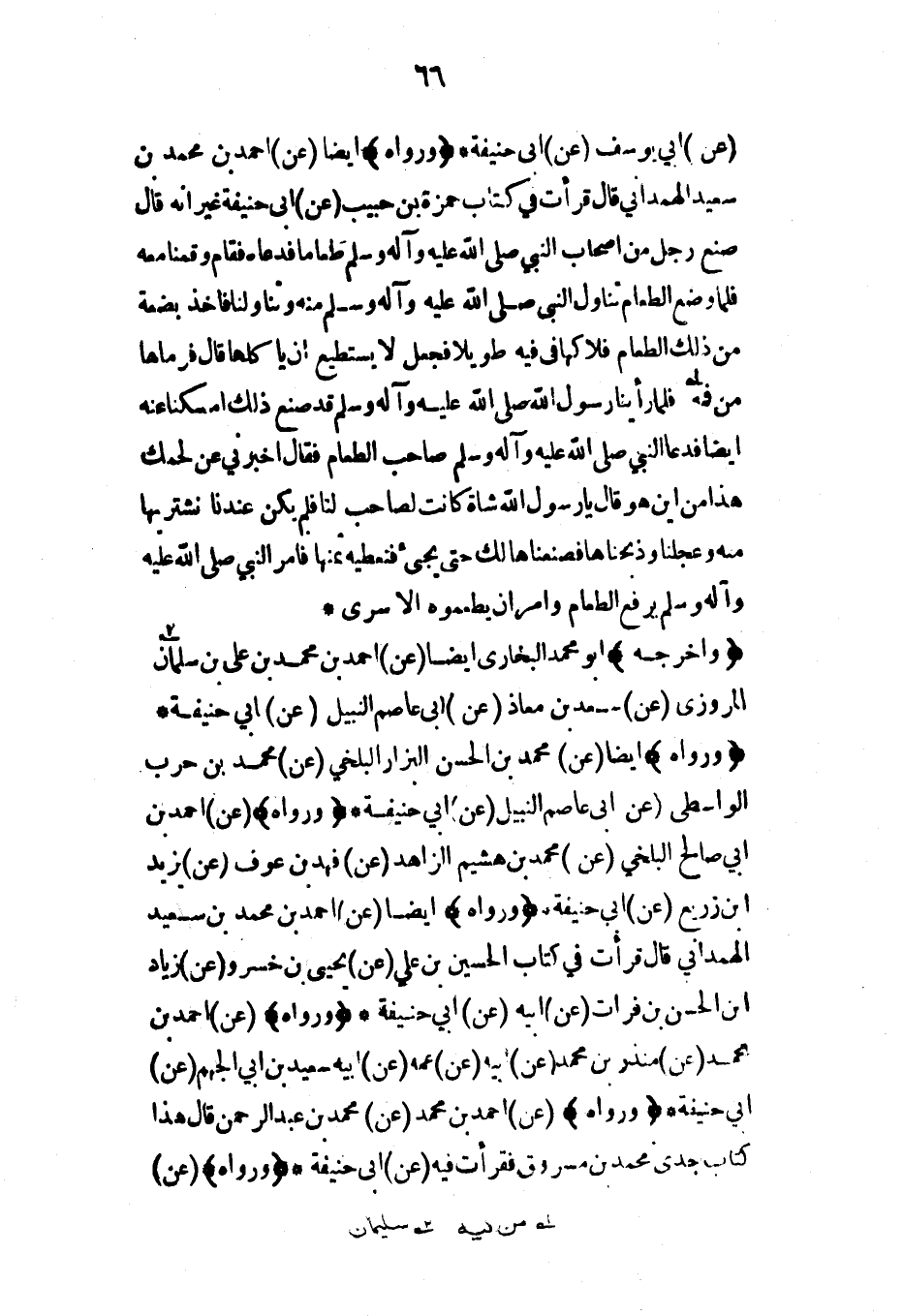 (وأخرجه) أبو محمد البخاري أيضاً (عن) أحمد بن محمد بن علي بن سلمان المروزي (عن) سعد بن معاذ (عن) أبي عاصم النبيل (عن) أبي حنيفة* (ورواه) أيضاً (عن) محمد بن الحسن البزار البلخي (عن) محمد بن حرب الواسطي (عن) أبي عاصم النبيل (عن) أبي حنيفة* (ورواه) (عن) أحمد بن أبي صالح البلخي (عن) محمد بن هشيم الزاهد (عن) فهد بن عوف (عن) يزيد ابن زريع (عن) أبي حنيفة* (ورواه) أيضاً (عن) أحمد بن محمد بن سعيد الهمداني قال قرأت في كتاب الحسين بن علي (عن) يحيى بن خسرو (عن) زياد ابن الحسن بن فرات (عن) أبيه (عن) أبي حنيفة* (ورواه) (عن) أحمد بن محمد (عن) منذر بن محمد (عن) أبيه (عن) عمه (عن) أبيه سعيد بن أبي الجهم (عن) أبي حنيفة* (ورواه) (عن) أحمد بن محمد (عن) محمد بن عبد الرحمن قال هذا كتاب جدي محمد بن مسروق فقرأت فيه (عن) أبي حنيفة* (ورواه (عن)