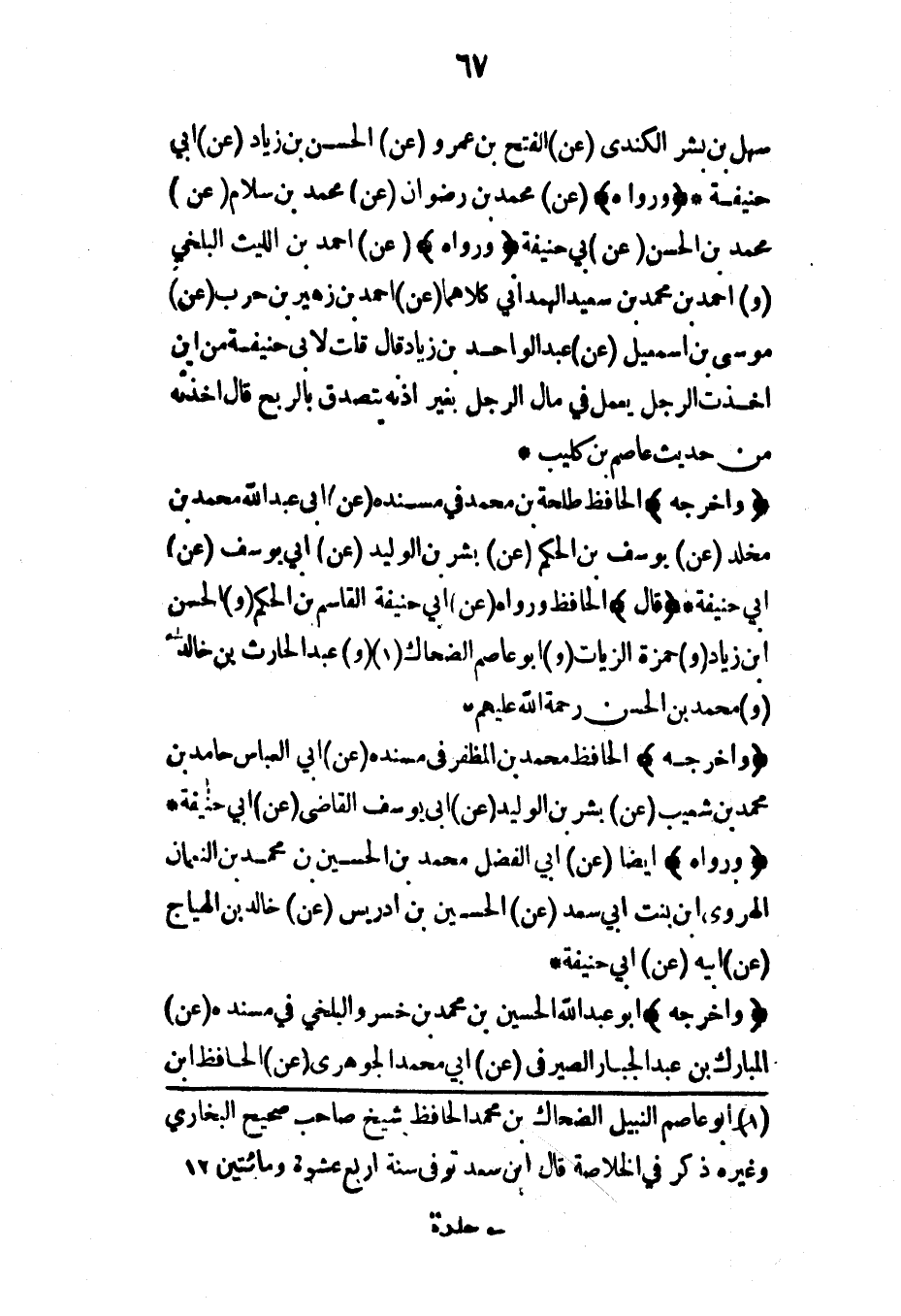 سهل بن بشر الكندي (عن) الفتح بن عمرو (عن) الحسن بن زياد (عن) أبي حنيفة* (ورواه) (عن) محمد بن رضوان (عن) محمد بن سلام (عن) محمد بن الحسن (عن) أبي حنيفة (ورواه) (عن) أحمد بن الليث البلخي (و) أحمد بن محمد بن سعيد الهمداني كلاهما (عن) أحمد بن زهير بن حرب (عن) موسى بن إسماعيل (عن) عبد الواحد بن زياد قال قلت لأبي حنيفة من أين أخذت الرجل يعمل في مال الرجل بغير إذنه يتصدق بالربح قال أخذته من حديث عاصم بن كليب*