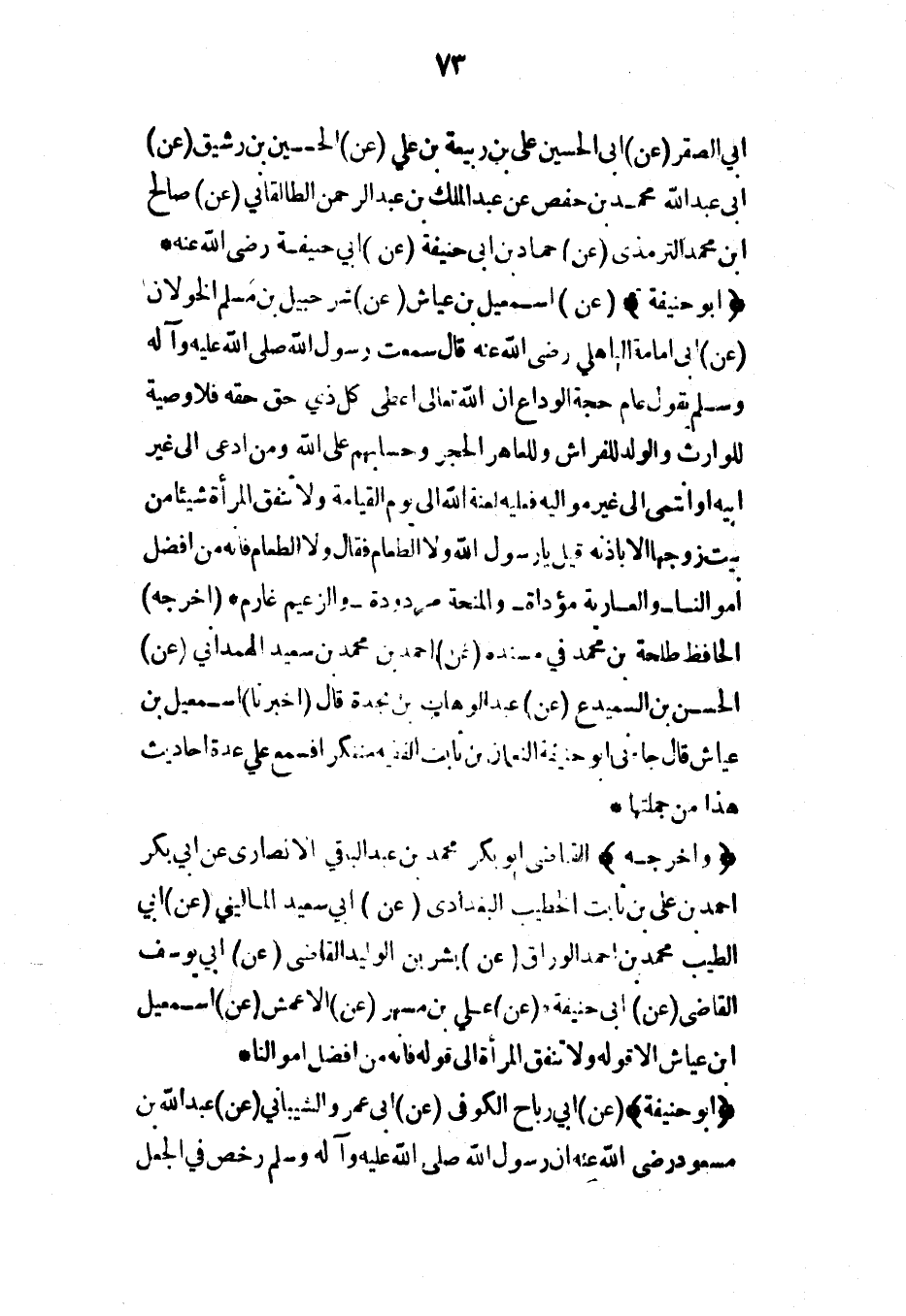 (أبو حنيفة) (عن) إسماعيل بن عياش (عن) شرحبيل بن مسلم الخولان (عن) أبي أمامة الباهلي رضي الله عنه قال سمعت رسول الله صلى الله عليه وآله وسلم يقول عام حجة الوداع أن الله تعالى أعطى كل ذي حق حقه فلا وصية للوارث والولد للفراش وللعاهر الحجر وحسابهم على الله ومن ادعى إلى غير أبيه أو انتمى إلى غير مواليه فعليه لعنة الله إلى يوم القيامة ولا تنفق المرأة شيئاً من بيت زوجها إلا بإذنه قيل يا رسول الله ولا الطعام فقال ولا الطعام فإنه من أفضل أموالنا -والعارية مؤداة- والمنحة مردودة- والزعيم غارم* (أخرجه) الحافظ طلحة بن محمد في مسنده (عن) أحمد بن محمد بن سعيد الهمداني (عن) الحسن بن السميدع (عن) عبد الوهاب بن نجدة قال (أخبرنا) إسماعيل بن عياش قال جاءني أبو حنيفة النعمان بن ثابت الفقيه متنكراً فسمع علي عدة أحاديث هذا من جملتها*