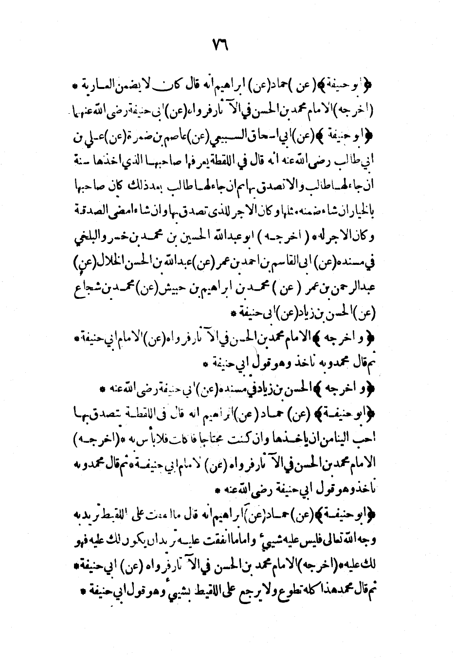 (أبو حنيفة) (عن) أبي إسحاق السبيعي (عن) عاصم بن ضمرة (عن) علي بن أبي طالب رضي الله عنه أنه قال في اللقطة يعرفها صاحبها الذي أخذها سنة إن جاء لها طالب وإلا تصدق بها ثم إن جاء لها طالب بعد ذلك كان صاحبها بالخيار إن شاء ضمنه مثلها وكان الأجر للذي تصدق بها وإن شاء أمضى الصدقة وكان الأجر له* (أخرجه) أبو عبد الله الحسين بن محمد بن خسرو البلخي في مسنده (عن) أبي القاسم بن أحمد بن عمر (عن) عبد الله بن الحسن الخلال (عن) عبد الرحمن بن عمر (عن) محمد بن إبراهيم بن حبيش (عن) محمد بن شجاع (عن) الحسن بن زياد (عن) أبي حنيفة*