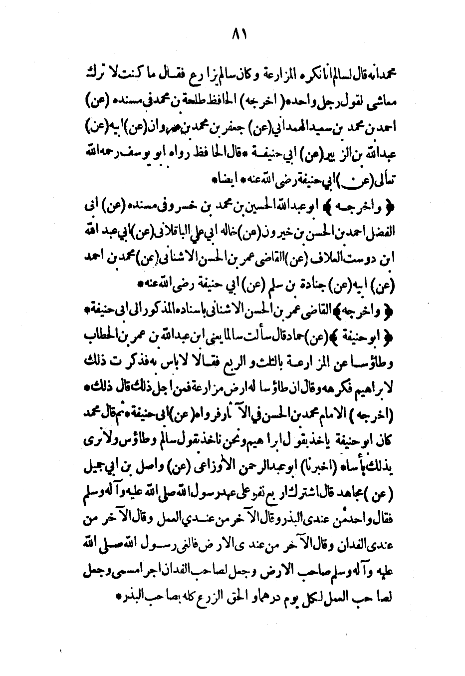 محمد أنه قال لسالم إنا نكره المزارعة وكان سالم يزارع فقال ما كنت لأترك معاشي لقول رجل واحد* (أخرجه) الحافظ طلحة بن محمد في مسنده (عن) أحمد بن محمد بن سعيد الهمداني (عن) جعفر بن محمد بن مروان (عن) أبيه (عن) عبد الله بن الزبير (عن) أبي حنيفة* قال الحافظ رواه أبو يوسف رحمه الله تعالى (عن) أبي حنيفة رضي الله عنه* أيضاً*