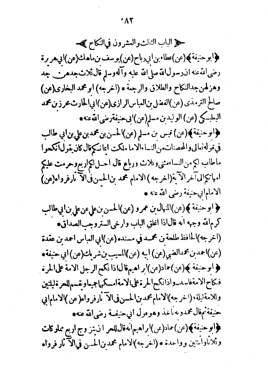 (أبو حنيفة) (عن) عطاء بن أبي رباح (عن) يوسف بن ماهك (عن) أبي هريرة رضي الله عنه أن رسول الله صلى الله عليه وآله وسلم قال ثلاث جدهن جد وهزلهن جد النكاح والطلاق والرجعة* (أخرجه) أبو محمد البخاري (عن) صالح الترمذي (عن) الفضل بن العباس الرازي (عن) أبي الحارث محرز بن محمد البعلبكي (عن) الوليد بن مسلم (عن) أبي حنيفة رضي الله عنه*